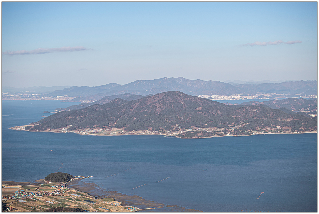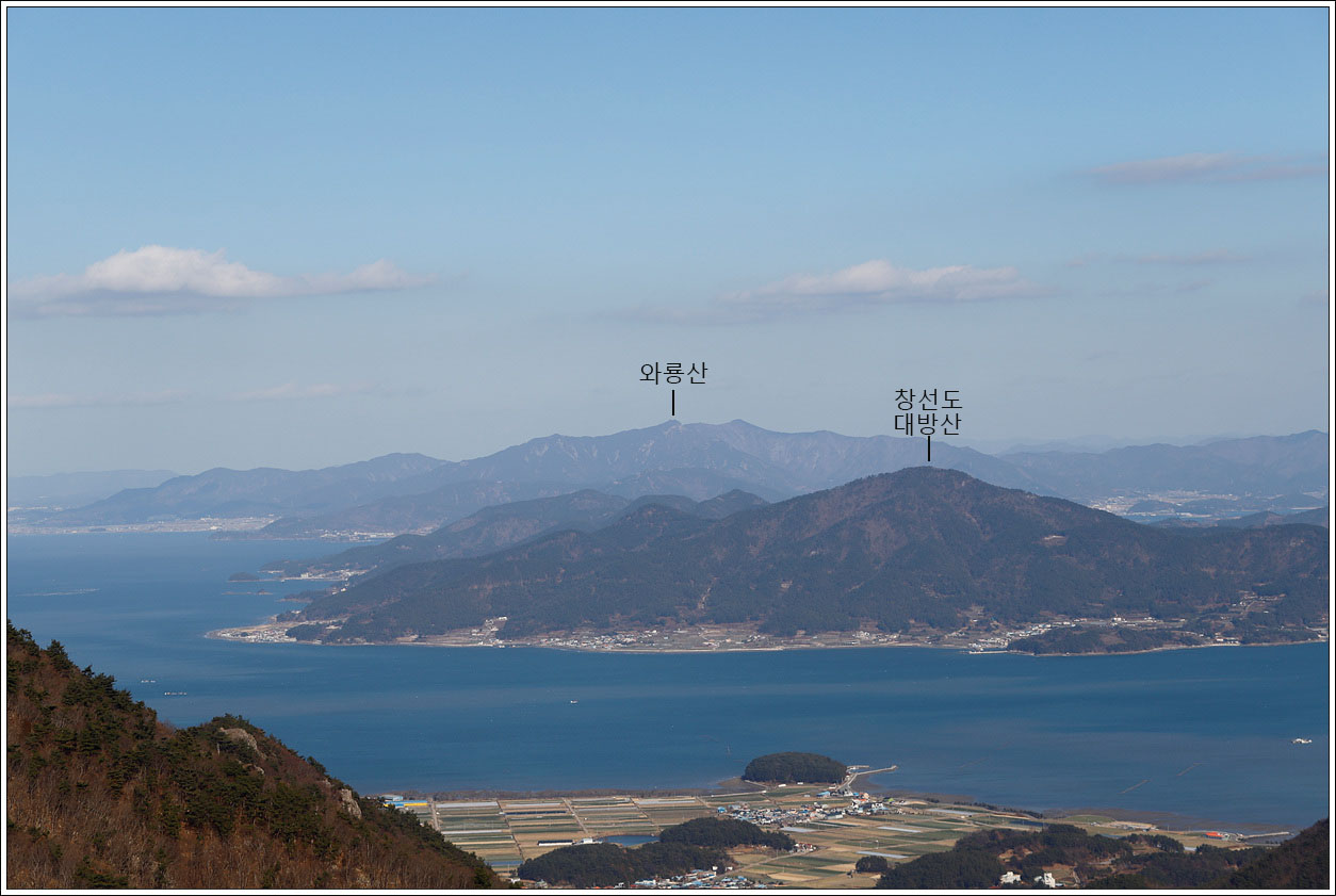 ▽ 북쪽방향으로 앞쪽 창선도의 대방산과 뒤쪽 멀리 사천의 와룡산...