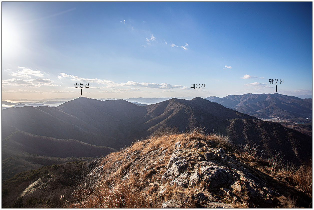 ▽ 봉화대 위에서 주변을 360도 회전해서 서쪽방향으로부터 시계방향으로 조망해 보기로 한다. 괴음산으로 부터 이곳까지 지나온 능선과 오른쪽으로 망운산이 보인다.