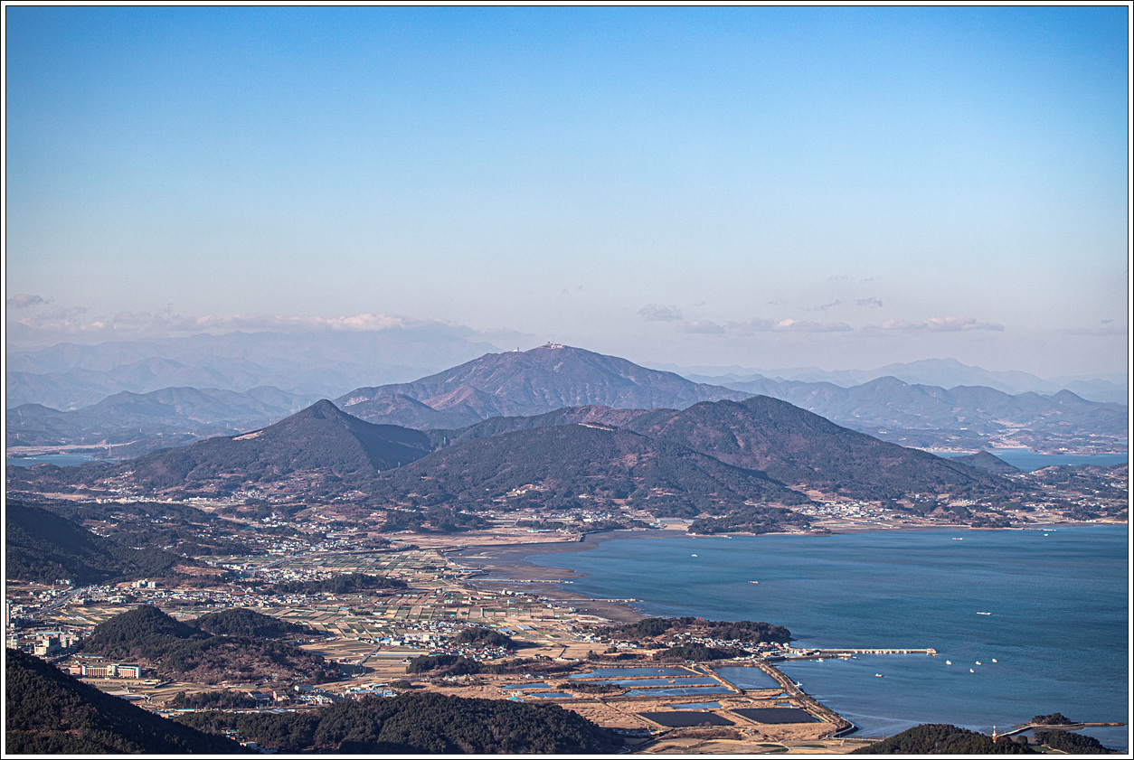 ▽ 북서방향으로 왼쪽 멀리 광양의 백운산, 오른쪽 멀리 지리산 천왕봉이 구름에 가려 선명하게 보이질 않는다. 바로 앞의 도시는 남해군청이 자리한 남해읍내이다.
