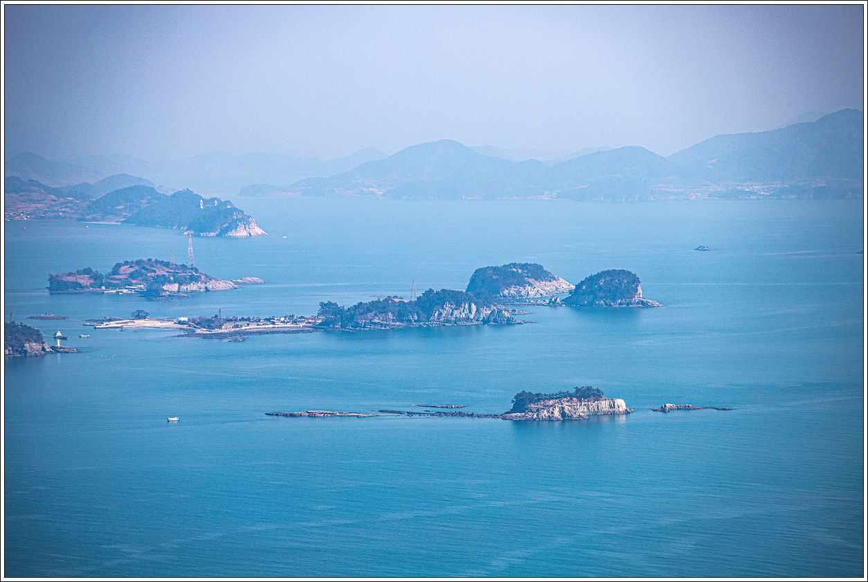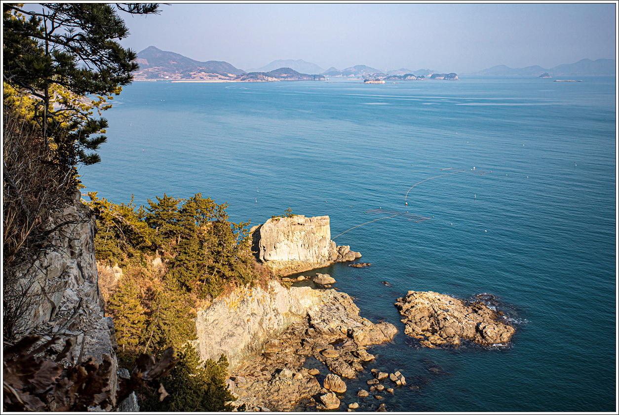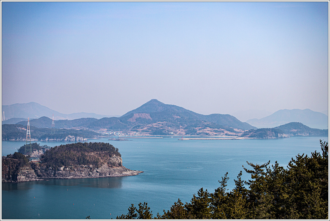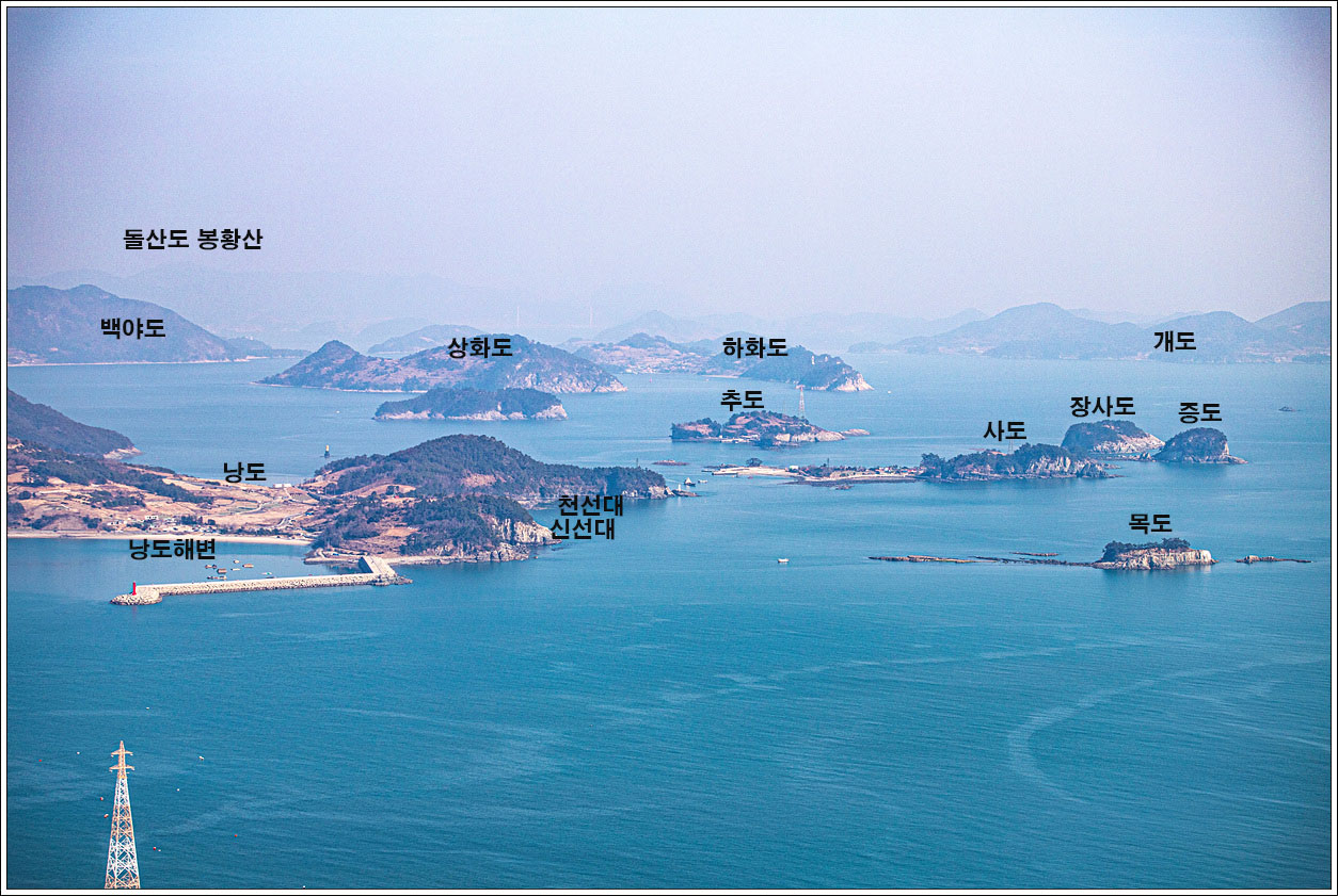 ▽ 낭도 남쪽 해안 앞쪽으로는 추도, 사도, 증도, 장사도와 뒷쪽으로 상화도, 하화도, 오른쪽으로는 개도가 흐릿하게 보인다.