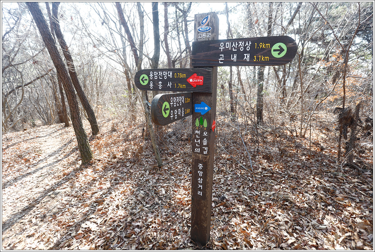 ▽ 우미산에서 반 원형으로 능선을 따라 돌다보면 왼쪽 우암전망대로 가는 길이 있고 곧장 용암전망대로 가는 중앙삼거리가 나오는데 용암전망대로 가야 알바를 면할 수가 있다.