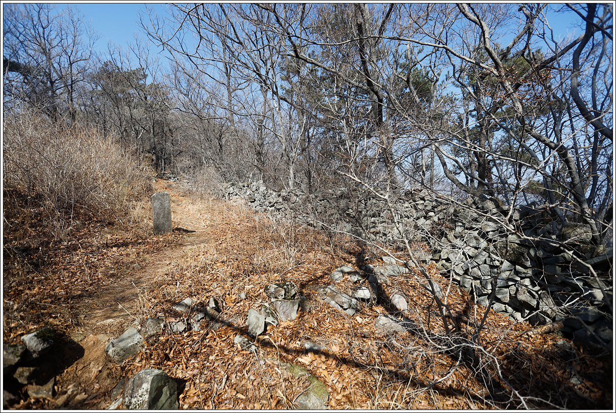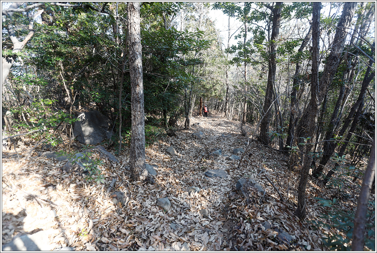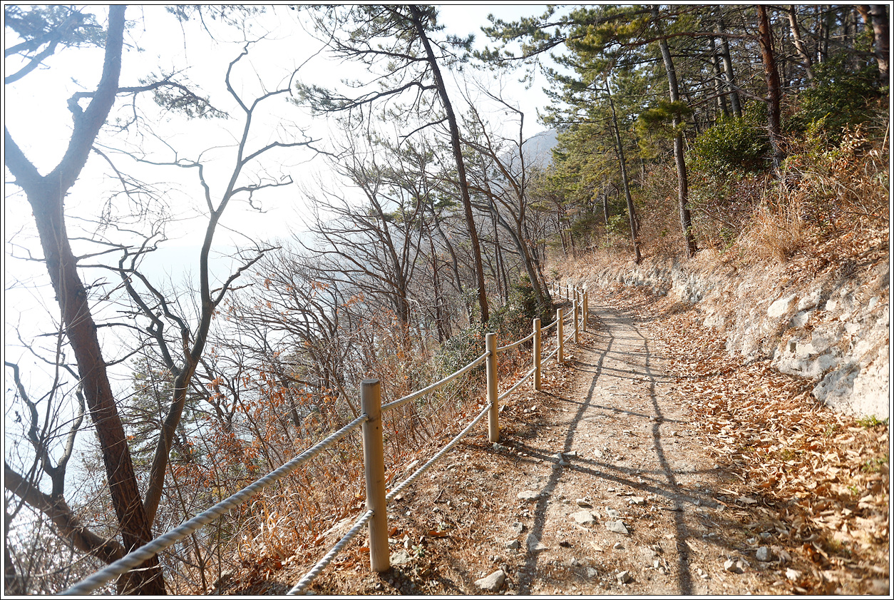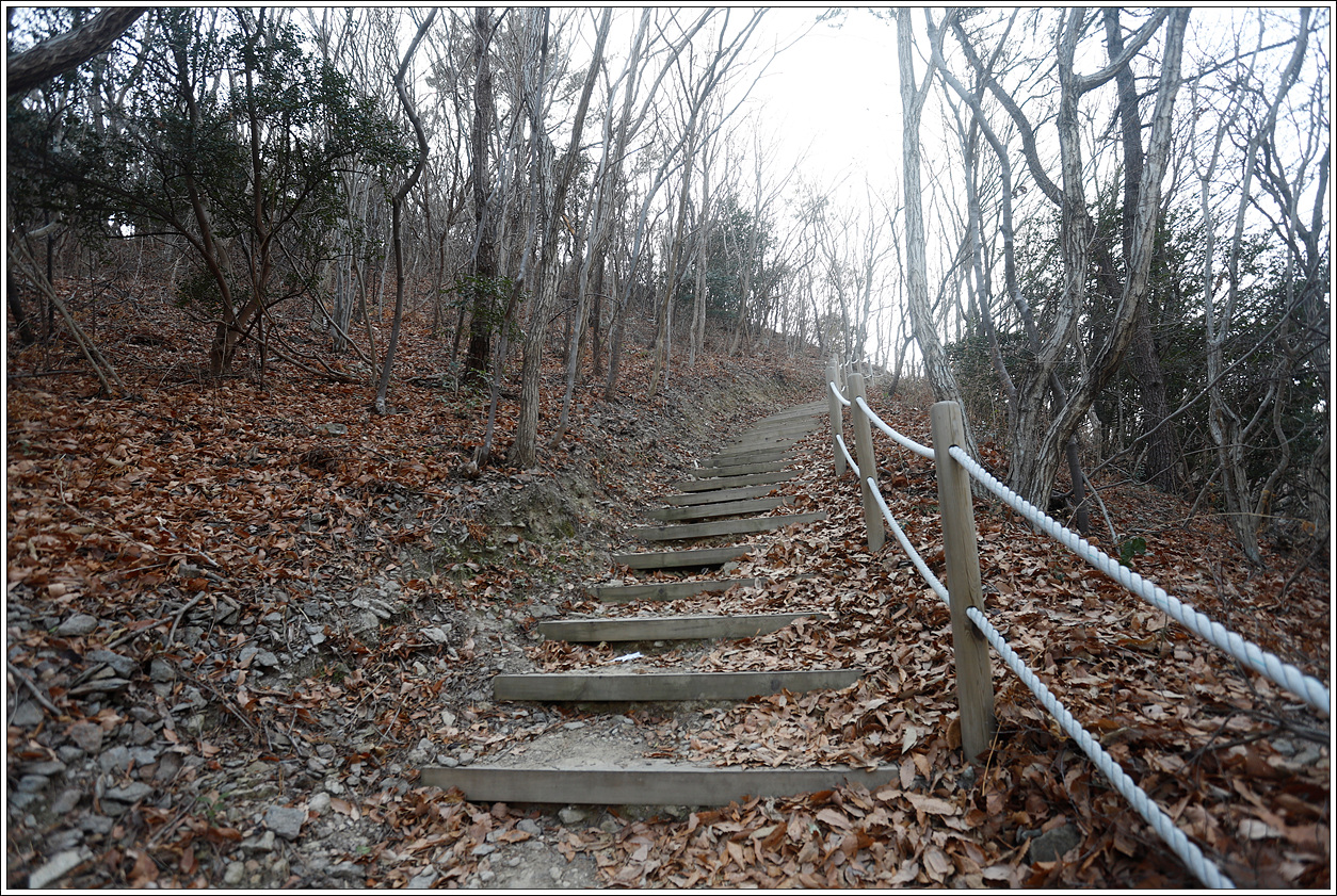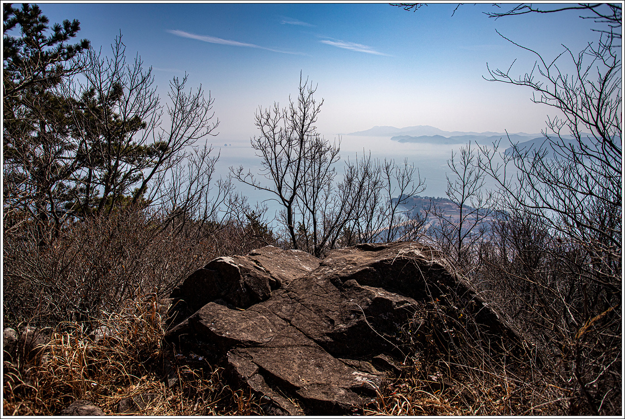 ▽ 낮으막해 보이는 산이기는 해도 그리 만만한 산은 아니다. 바람도 없고 영상7도나 되는 날씨다 보니 얇은 옷을 입고도 땀이 흥건히 고인다. 어딘가에 변산바람꽃이나 복수초가 피어 있을 것만 같다. 이곳이 남열전망대라고 산행지도에 표시되어 있는 것 같은데 데크로 된 전망대로 기대했지만 남서쪽으로 살짝 조망을 할 수 있는 그냥 작은 바위가 덜렁 하나 있는 곳이다.