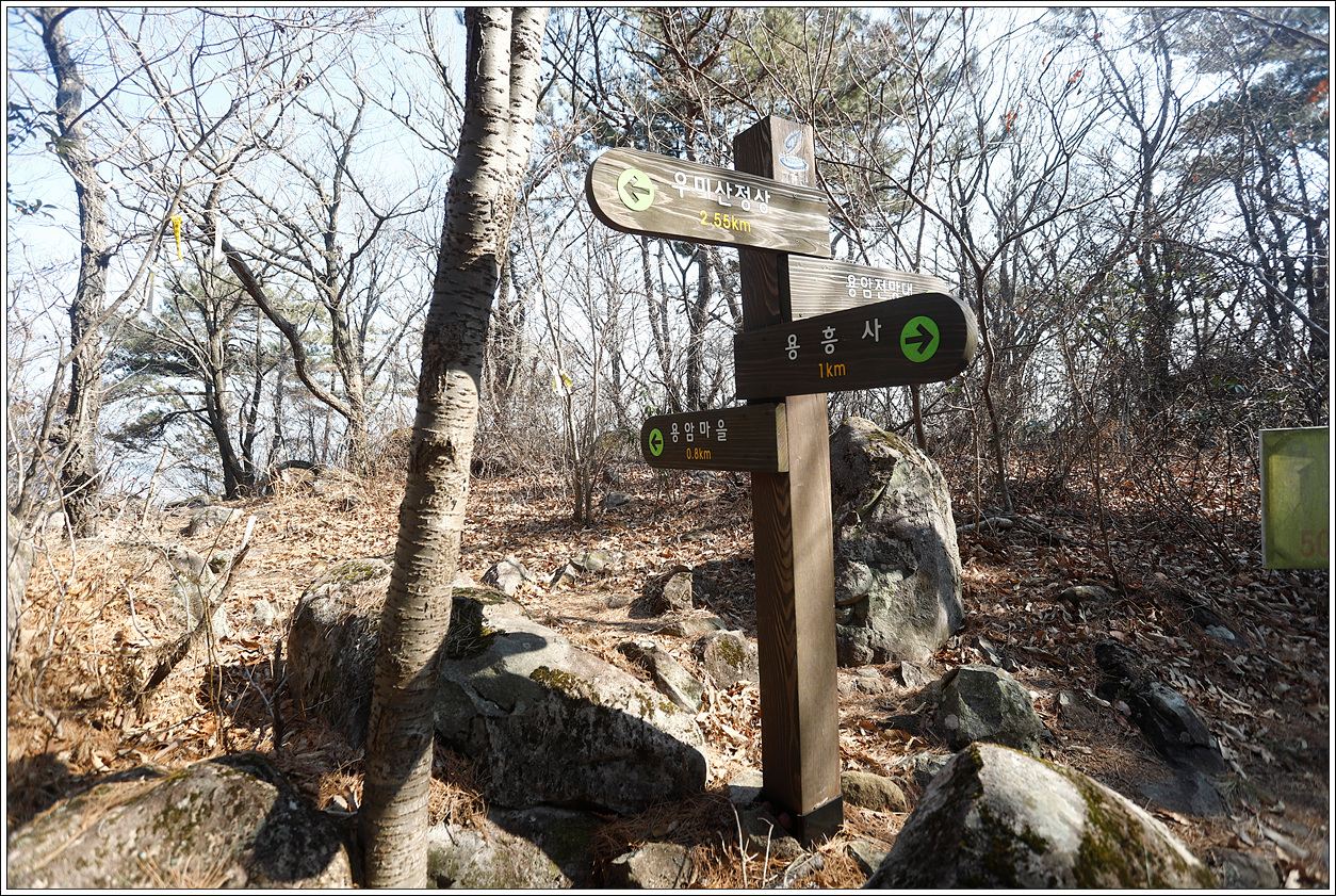 ▽ 서울 시청역에서 들머리에 도착 시간은 꼬박 5시간이 걸린 12:00이다. 주어진 시간은 4시간 30분으로 16:30까지 산행마감 시간이다. 오늘은 A코스가 우미산을 올랐다가 하산하여 미르마루길(용바위~용굴~사자바위모형상~우주발사전망대)을 걷는 코스이고, B코스는 미르마루길만 걷는 코스인데 트레킹이 아닌 산행이 목적이므로 A코스를 타기로 한다.