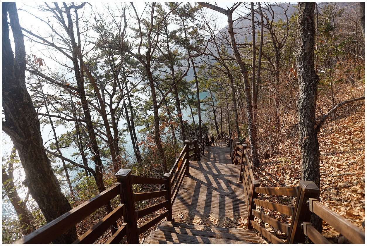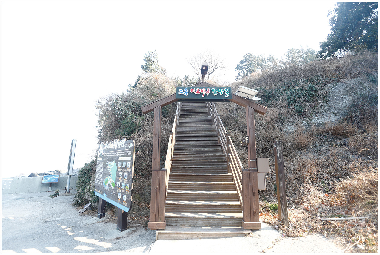▽ 다시 선착장 쪽으로 와서 미르마루길을 걷기로 하는데 이 데크계단을 오르면서 시작된다.