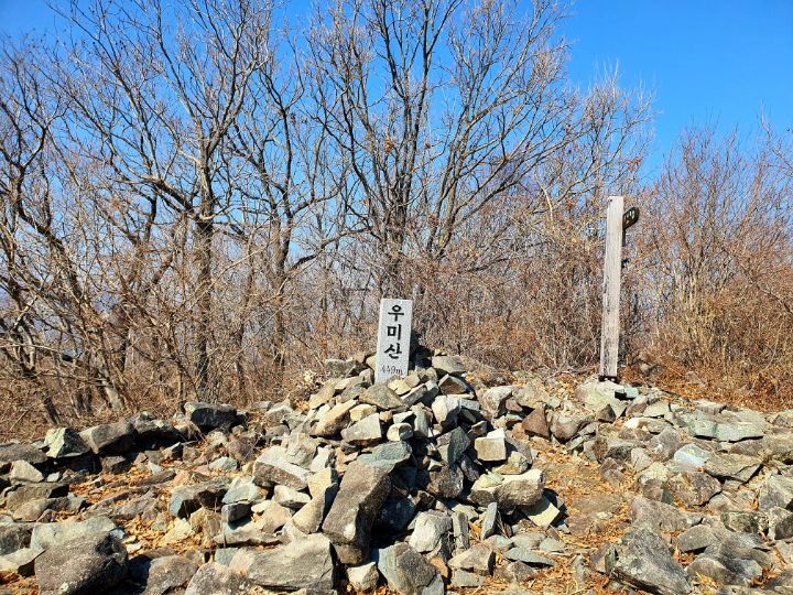 우미산이라는 이름이 소개된 곳이 없는데 북쪽으로 우각산이 있는 것을 봐서 산세가 소를 닮아 우각산(牛角山)은 소뿔을 뜻하고, 우미산(牛尾山)은 소꼬리를 뜻하여 부르는 것으로 추정해 본다. 북쪽으로는 팔영산이 멋지게 솟아 있을텐데 잡목으로 인해 전혀 조망을 할 수가 없어서 아쉽다.
