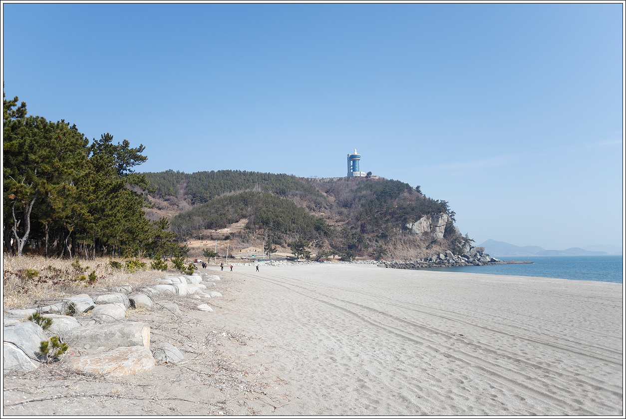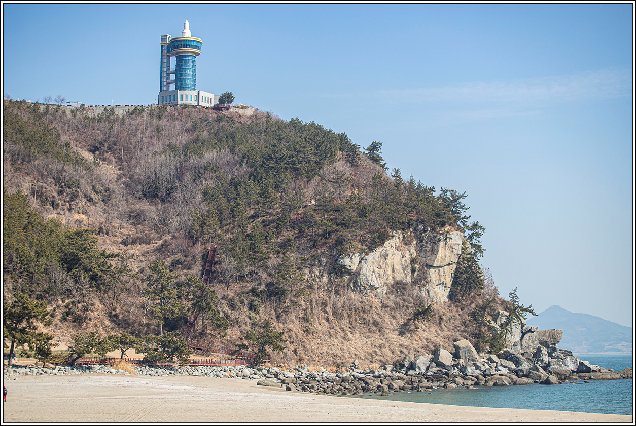 ▽ 주차장에서 바로 해변으로 나오니 고운 모래의 백사장이 펼쳐진다. 날씨는 맑고 봄날과 같이 온화하나 미세먼지가 좀 있는 것이 흠이긴 하다. 우주발사전망대는 작년 11월 27일 건너편 여수의 낭도, 추도, 사도 등 등의 섬 산행을 하면서 멀리서 보아왔기에 낯익은 모습이다.
