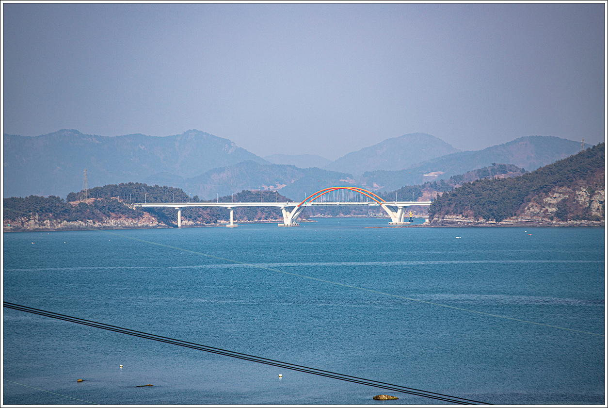 ▽ 왼쪽 끝으로 여수 적금도에서 낭도로 이어지는 적금대교(470m)가 나뭇가지 속으로 보이고, 가운데 다리는 낭도에서 둔병도로 이어지는 낭도대교(640m)이며, 둔병도에서 조발도로 이어지는 다리는 낭도대교 왼쪽 위로 보일 듯 말 듯 둔병대교(990m)라고 하고, 다시 조발도에서 육지인 여수의 화양면 장수리로 이어지는 조화대교(854m)의 주탑이 보인다. 이 네개의 다리는 모두 2020년 2월 28일 개통이 됨으로 인해 고흥에서 여수로 이어지는 섬아닌 섬들이 되었다.