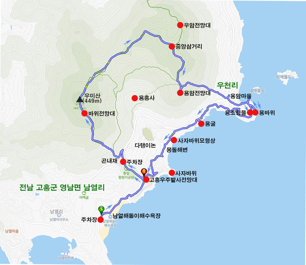 ♣ 산행코스: 남열리해변-우주발사대전망대-곤내재-우미산-중앙삼거리-용암마을-미르바루길-곤내재주차장