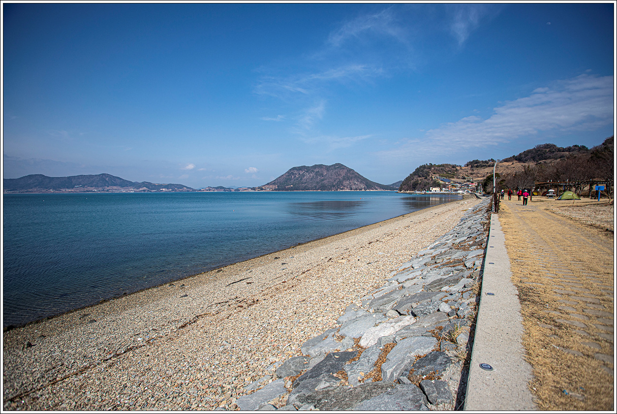 ▽ 작은 몽돌로 이뤄진 바다를 보며 곧게 뻗은 길을 따라 선착장으로 향한다. 야생화 공원이 있긴 하지만 식재된 꽃이 필 시기가 아니어서 실감이 나질 않고 대신 몇 몇 백배킹 족이 자리잡고 있다.