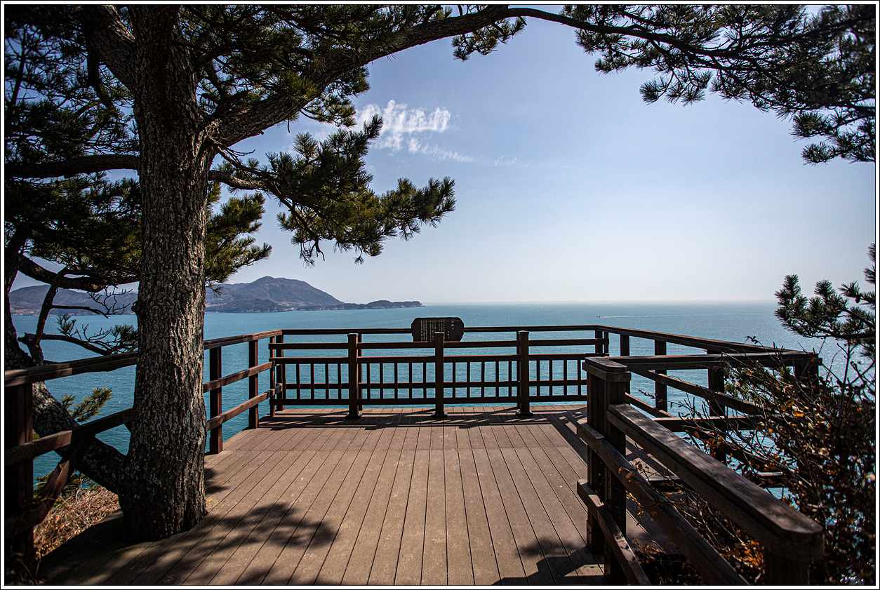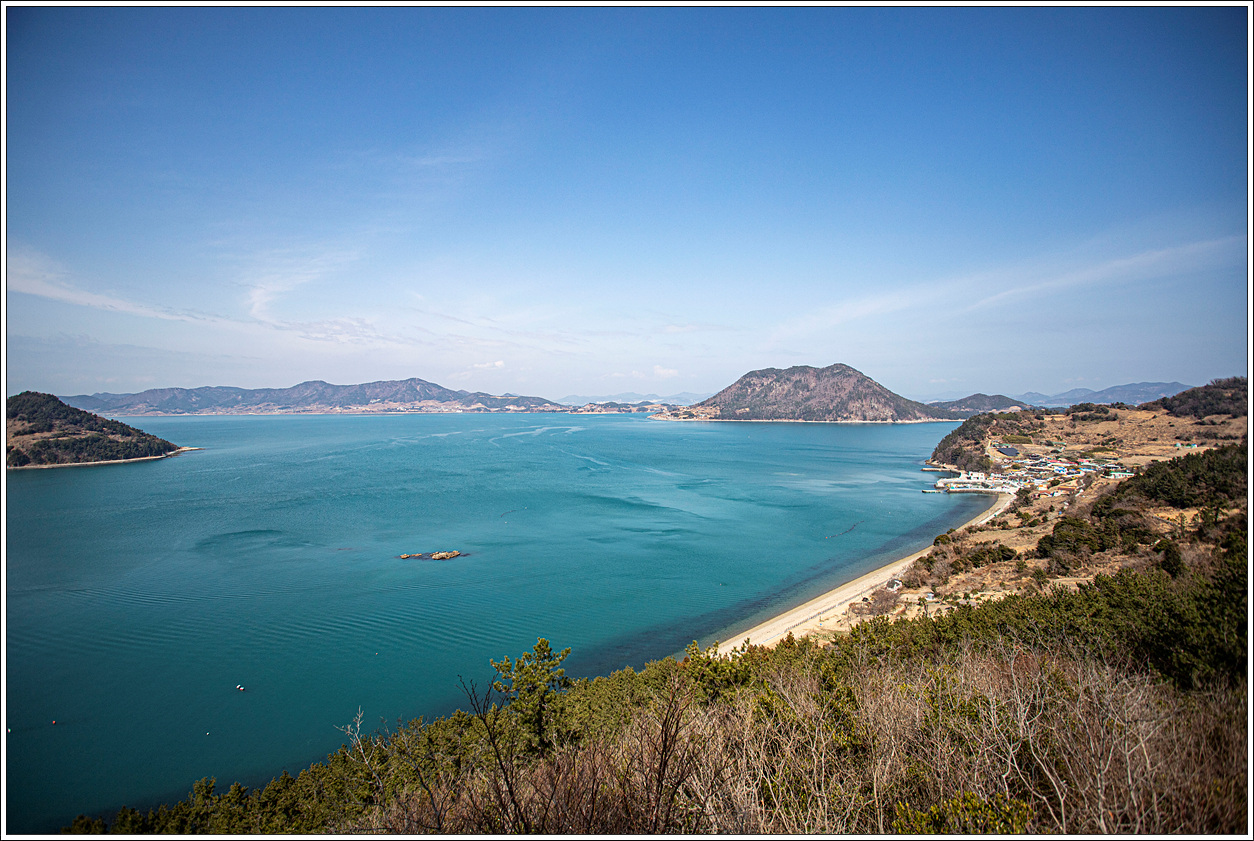 ▽ 해안 풍경과 개도, 오른쪽 외나로도 사이의 망망대해의 수평선...