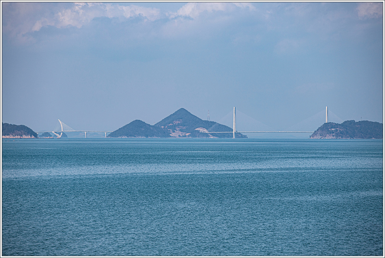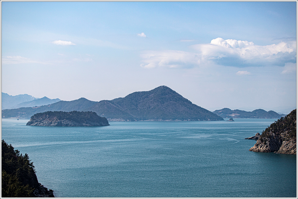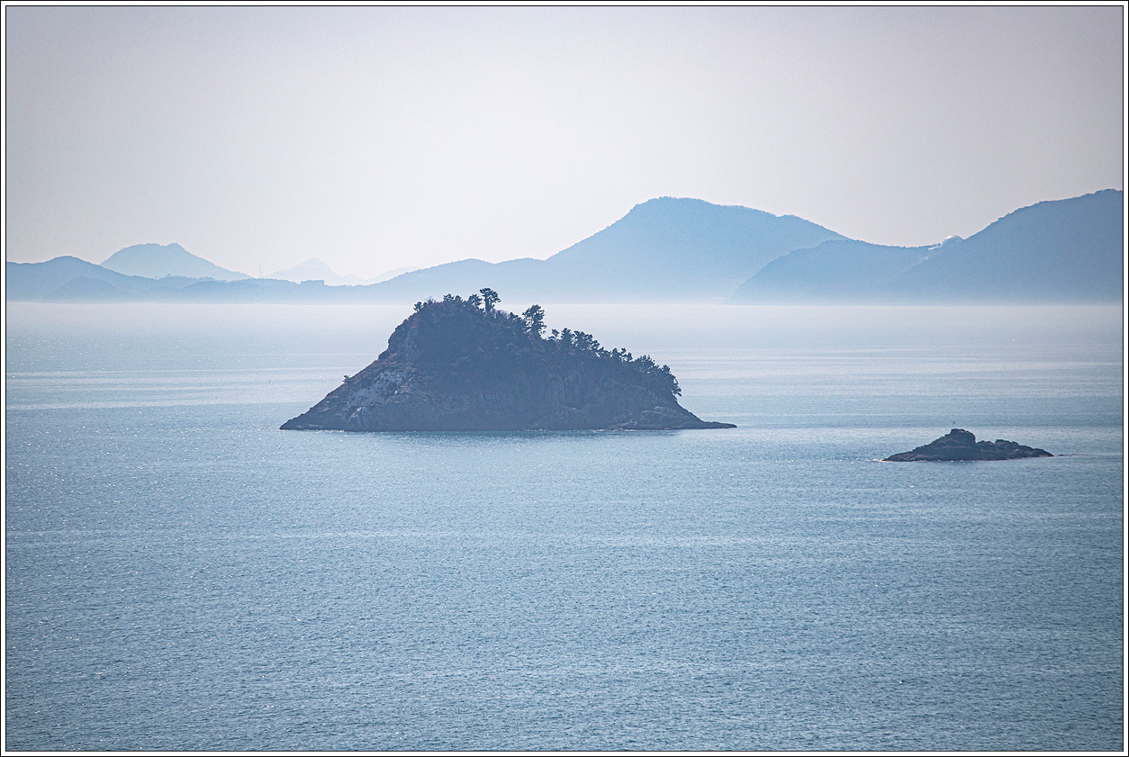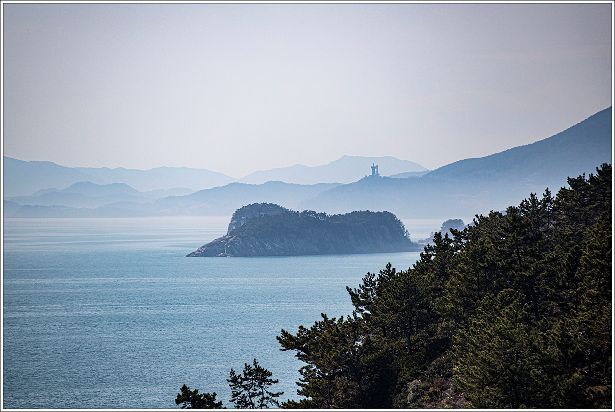 ▽ 렌즈로 당겨 본 풍경으로 왼쪽이 장사도, 가운데 사도, 오른쪽 전선탑이 있는 추도이다. 가운데 멀리 고흥의 우주발사전망대가 보인다.