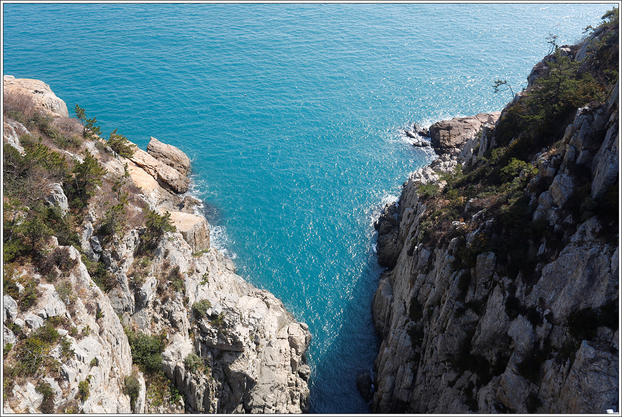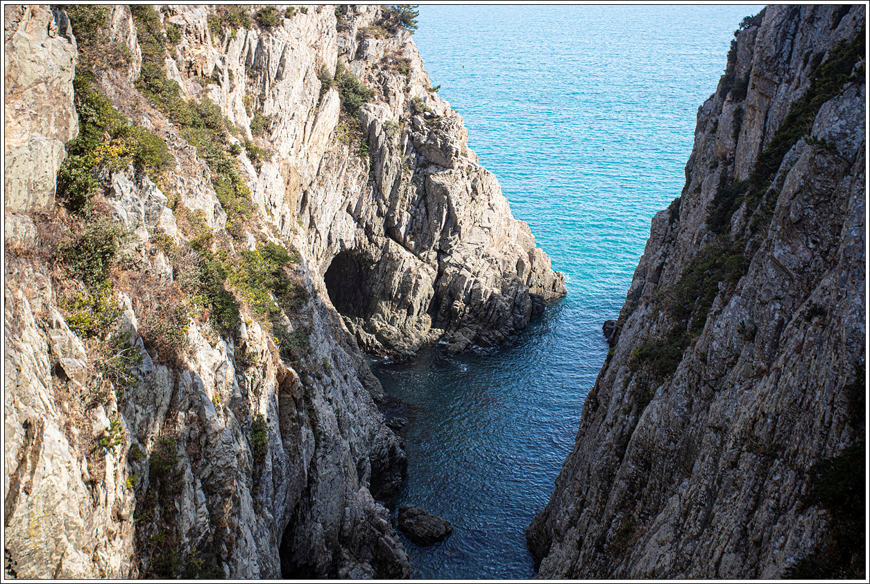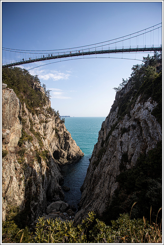 ▽ 협곡 아래에 해식동굴인 큰굴이 자리하고 있고 위로 협곡을 연결한 꽃섬다리의