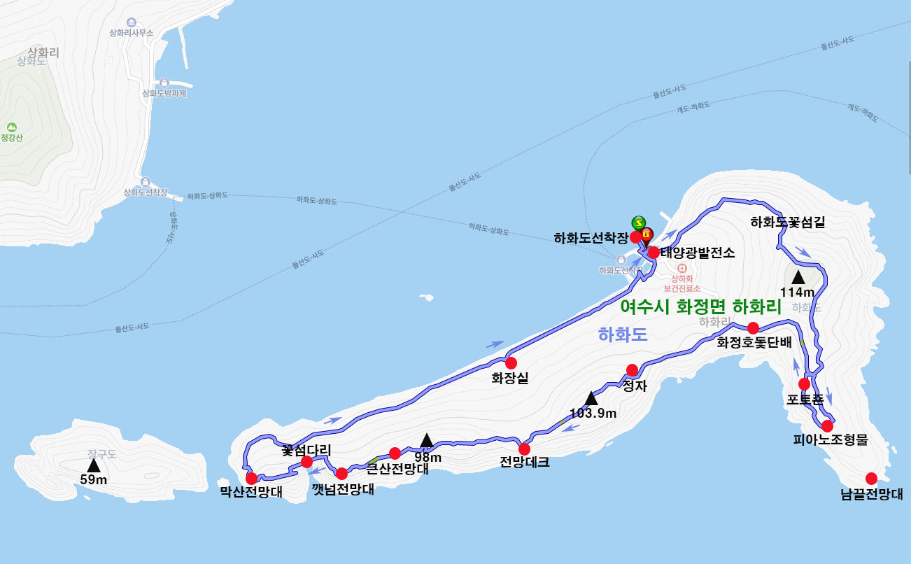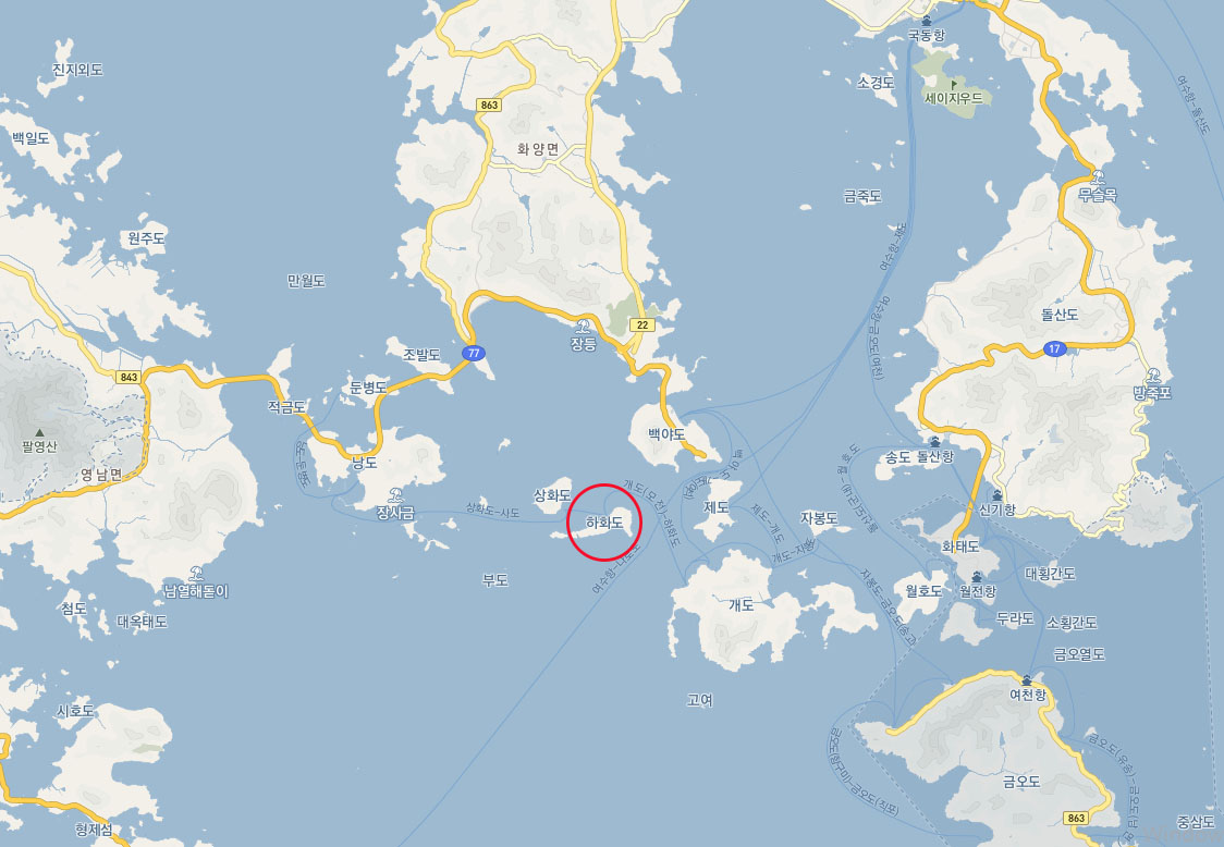▽ 하화도는 여수시 화정면에 속하는 섬으로 지도에서 보는 바와 같이 그 일대의 섬이 모두 화정면에 속할 정도로 많은 섬을 거느리고 있다. 작년 11월 27일 낭도 일대를 가 보는 것이 인연이 되어 백야도, 개도, 하화도를 찾게 되었으니 이제 이곳도 오늘로 마침표를 찍어야 할 것 같다.
