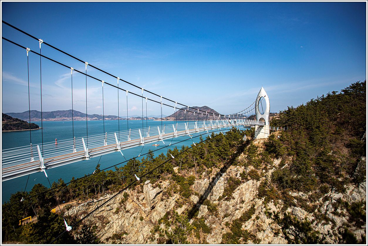 ▽ 꽃섬다리에 도착했다. 꽃섬다리는 케이블을 이용한 현수교 방식인 꽃섬다리 건설에는 2014년 착공 이후 총 26억원이 투입되어 길이 100m, 폭 1.5m짜리 출렁다리로서 2017년 3월 21일 개통됐으며 남해의 비경을 감상할 수 있도록 주민들이 ‘큰 굴’이라고 부르는 협곡에 65m 높이로 설치됐다. 열흘이 지나면 개통 5주년이 되는 날이다.