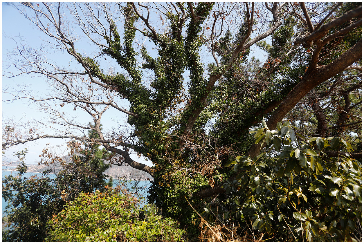▽ 길가에 나무는 송악으로 인해 몹시 시달려 보인다. 마치 주객이 전도된 것처럼 덩굴성 상록식물인 송악이 주인 행세를 하고 있다. 송악은 땅을 기어다니거나 절벽, 담, 나무등을 타고 왕성하게 자란다. 제주도에서는 돌담에 심어 담이 넘어가지 않게 하는 용도로 식재하기도 한다.
