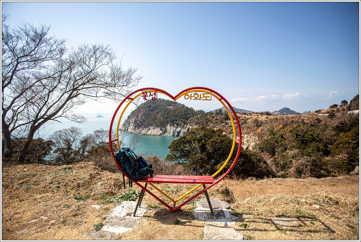 ▽ 하화도의 최고봉은 114m로 최고봉을 오르면서 서쪽으로 길게 뻗은 지형과 오른쪽 상화도 사이의 쪽빛 바다의 시원한 풍경을 마주하게 된다.