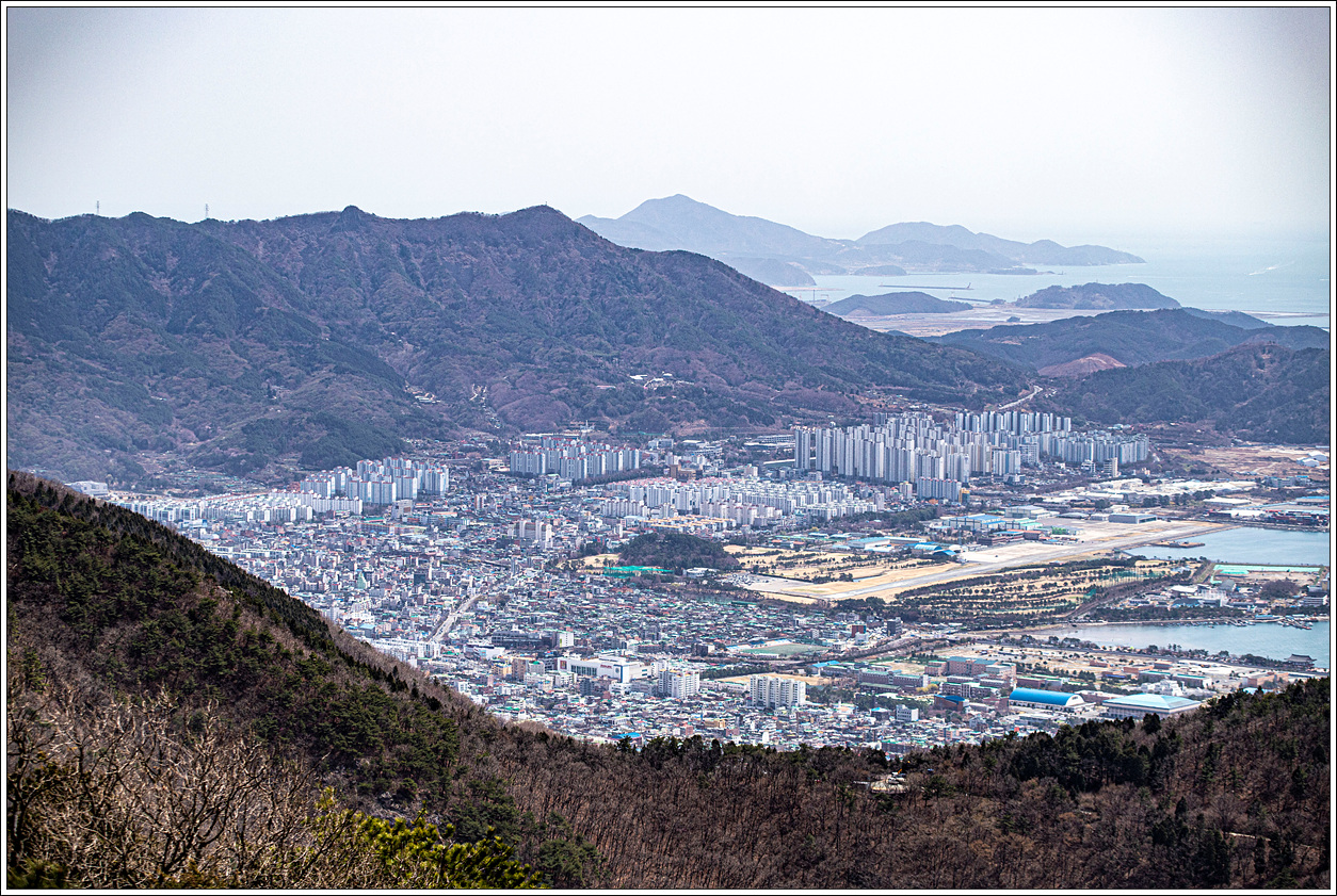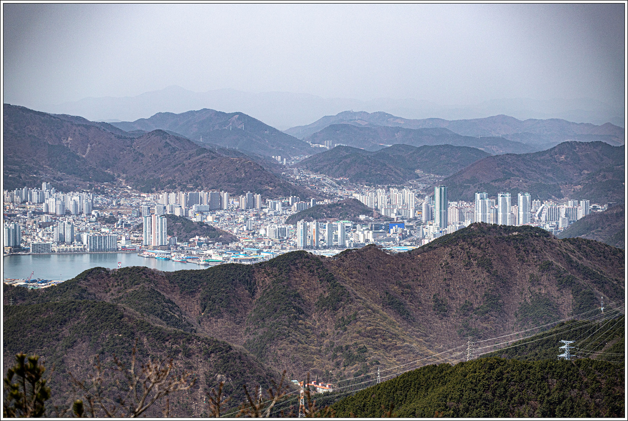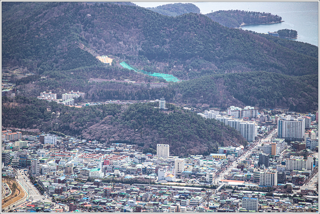 ▽ 다시 카메라를 동쪽 방향으로 돌려 렌즈로 당겨 본다. 왼쪽 시루봉, 수리봉, 천자봉으로 이어지는 능선과 가운데 멀리 가덕도의 연대봉(459.4m)이 보이고 진해구청이 있는 시내가 한 눈에 들어온다.