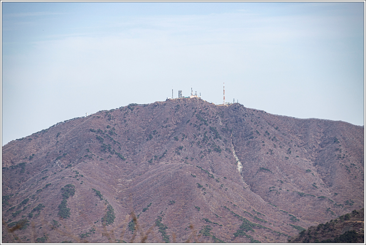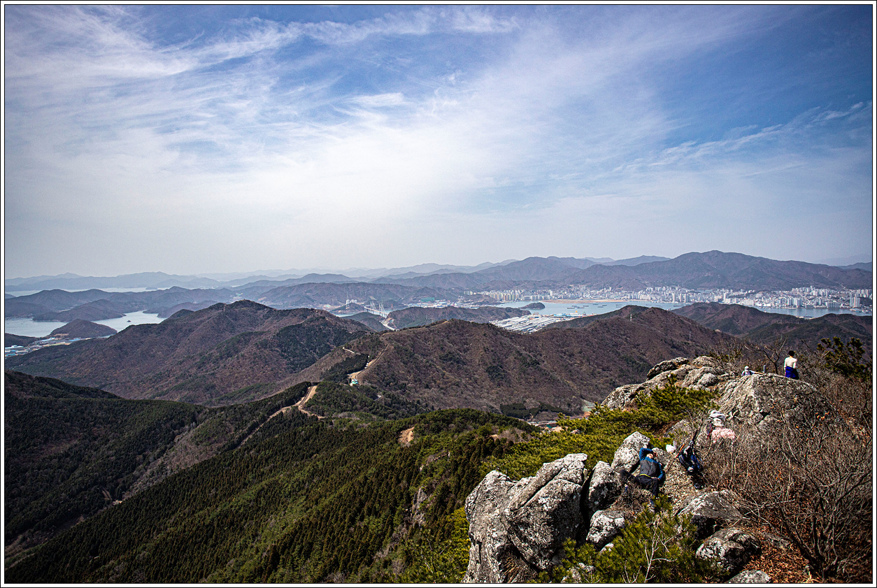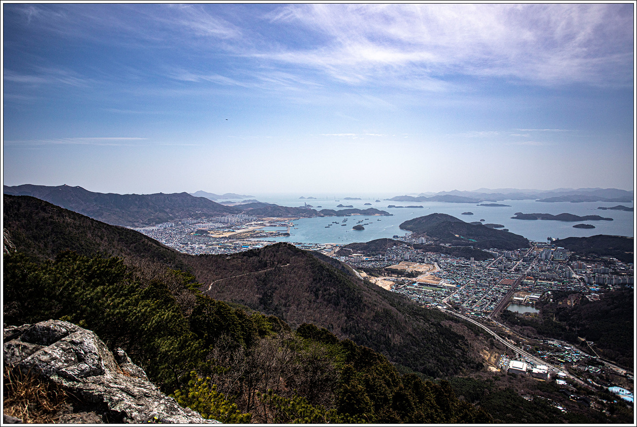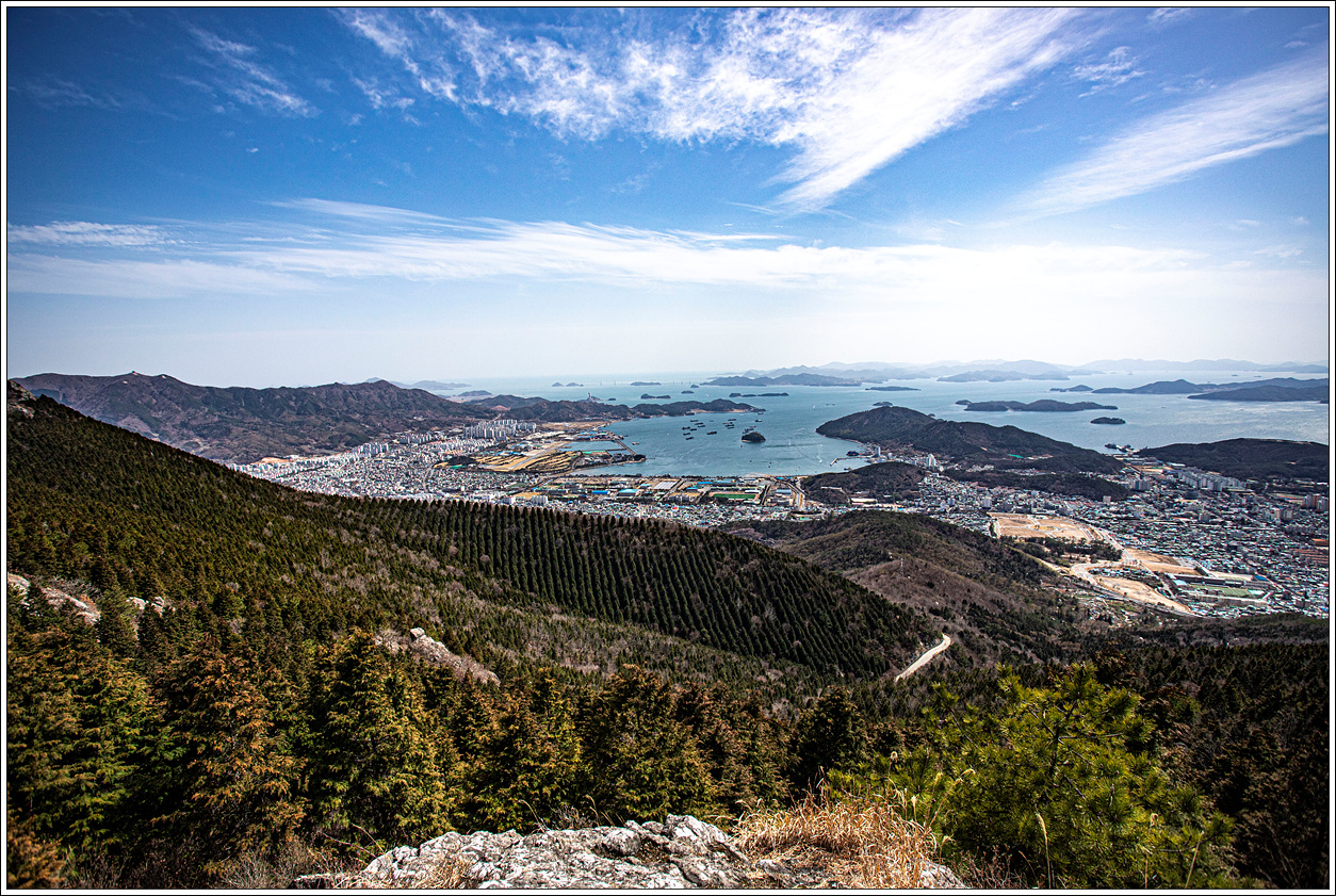 ▽ 다시 카메라를 동쪽 방향으로 돌려 렌즈로 당겨 본다. 왼쪽 시루봉, 수리봉, 천자봉으로 이어지는 능선과 가운데 멀리 가덕도의 연대봉(459.4m)이 보이고 진해구청이 있는 시내가 한 눈에 들어온다.
