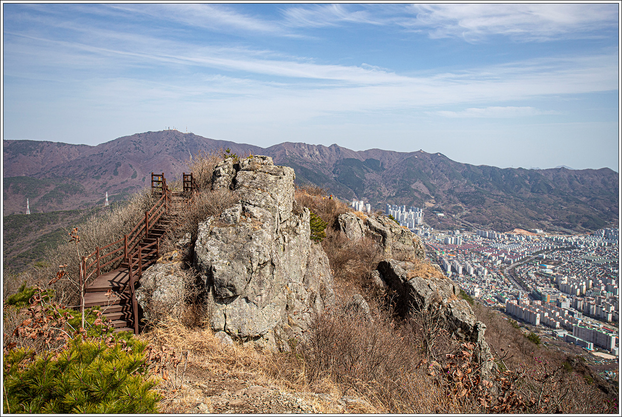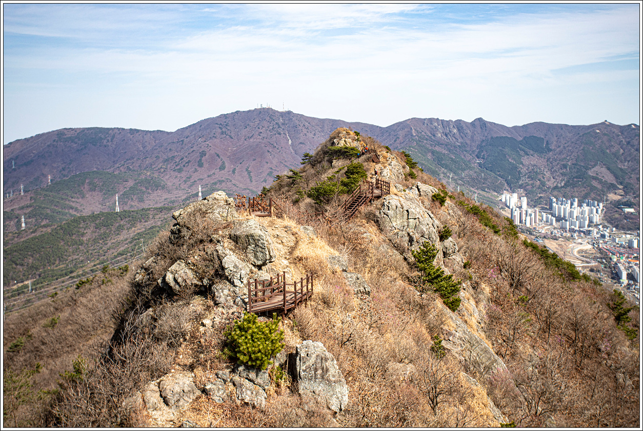 ▽ 북쪽으로 멀리 정병산(566.3m)~비음산(510m)~대암산(675.8m)~용지봉(744.7m)으로 이어지는 능선 아래로 창원특례시청, 경남도청이 자리잡고, 창원국가산업단지가 포진해 있다.
