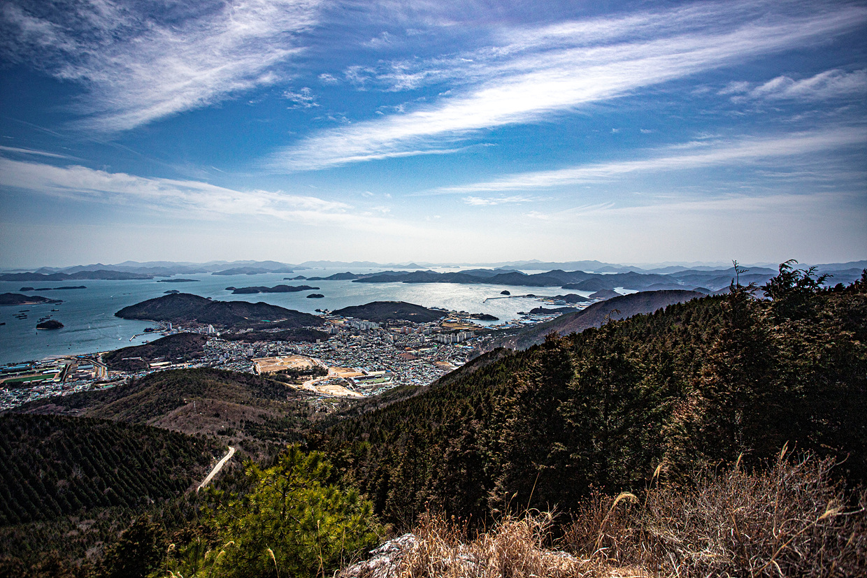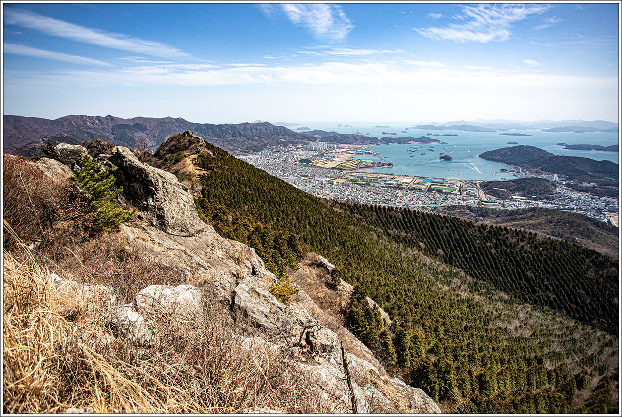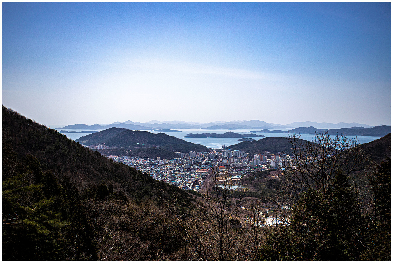 ▽ 삼밀사에서 내려다 본 조망...멀리 거제도가 한 눈에 들어온다.