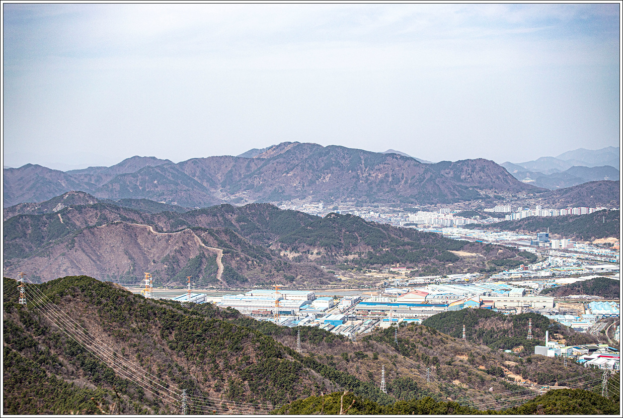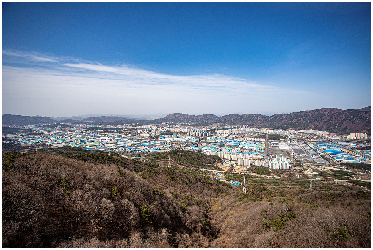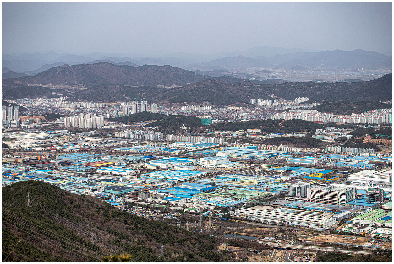 ▽ 다시 한번 북쪽 방향의 창원국가산업단지를 살펴 본다. 산으로 둘러 쌓인 아늑한 분지형태의 산세에 자리한 모습이다.