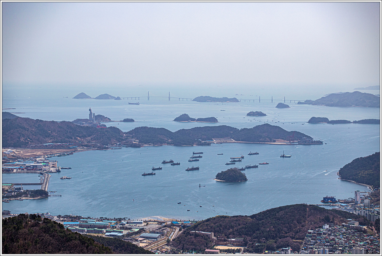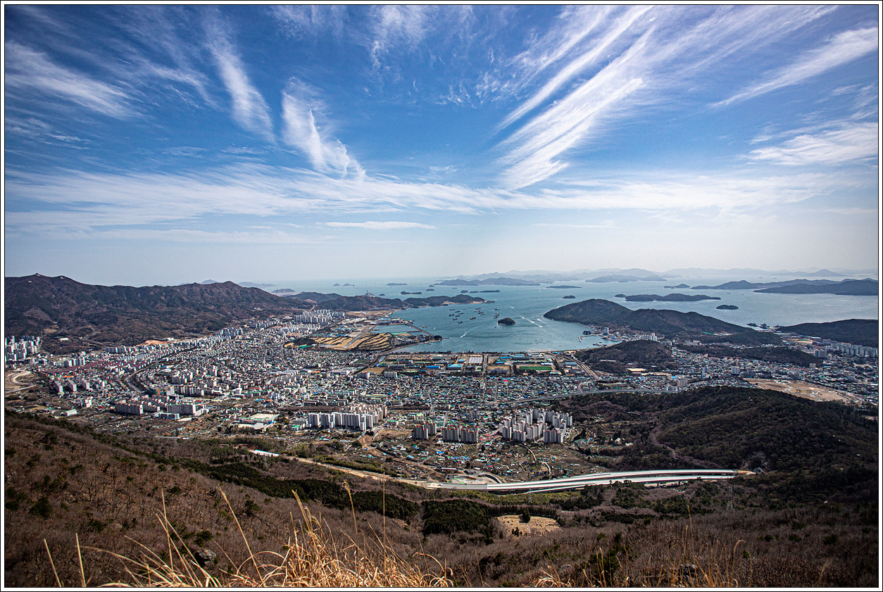 ▽ 진해 앞바다를 당겨 보니 음지도에 우뚝 솟은 진해해양공원의 창원솔라타워가 보이고 멀리 왼쪽으로 보이지 않는 가덕도와 해저터널로 대죽도까지 연결되어 다시 가운데 저도와 오른쪽 거제도를 연결한 거가대교가 시원스레 조망된다.