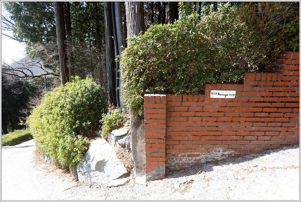 ▽ 사찰 경내를 둘러 보고 100여 미터 내려오다 보면 오른쪽으로 등산로라는 작은 안내표지가 보이고 축대 위로 오르면서 산길로 접어든다.