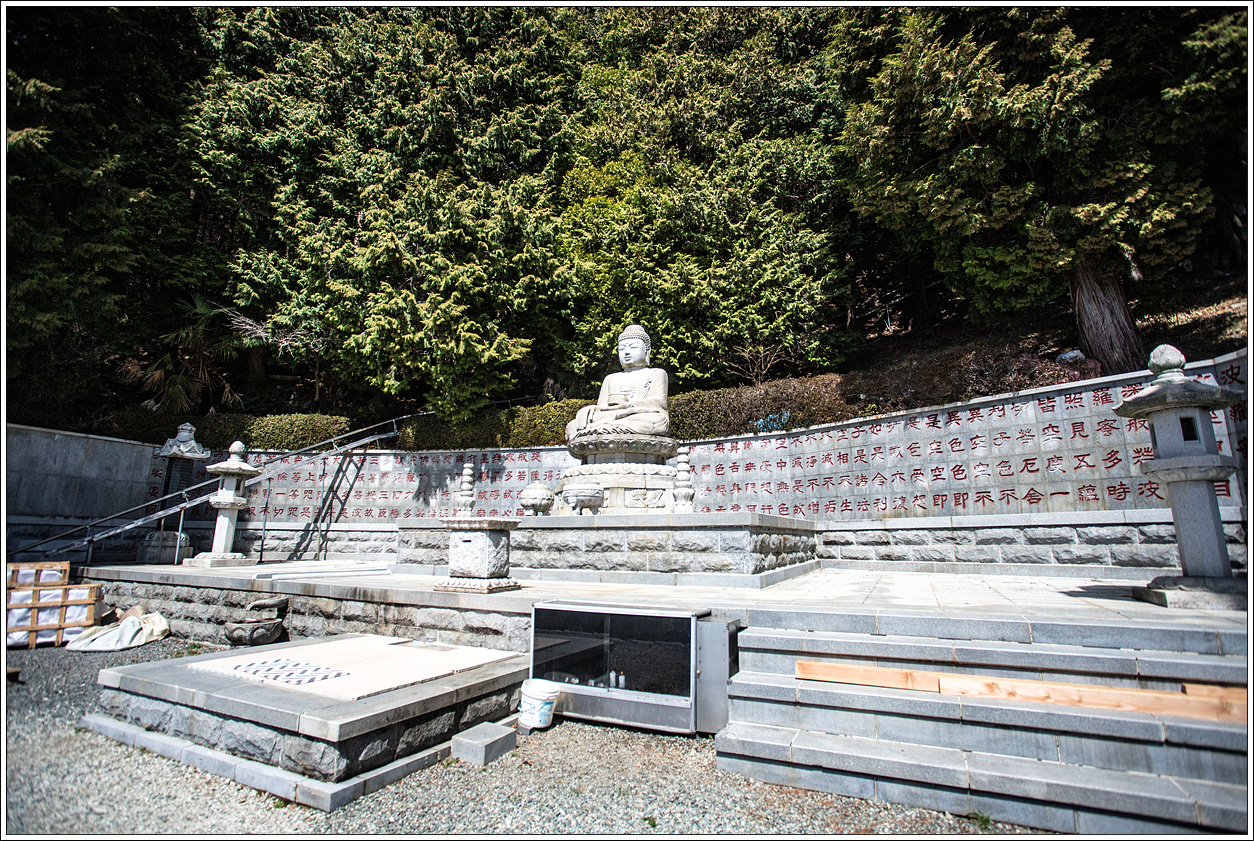 ▽ 편백나무 아래 마치 봄볕이라도 쐬듯, 부처의 모습이 온화해 보인다.