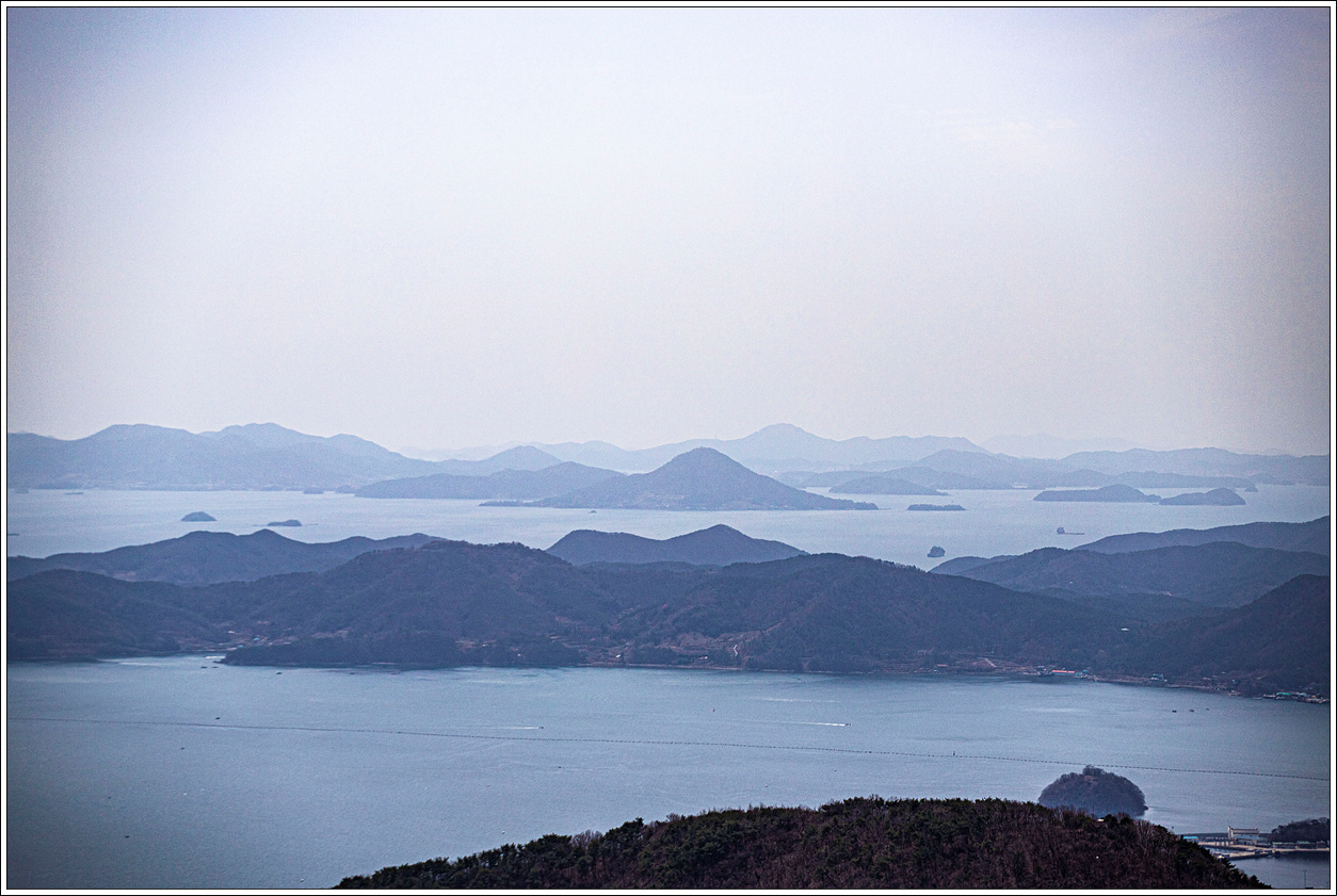 ▽ 가운데 볼록한 산이 거제 가조도의 옥녀봉으로 거제도에는 거제의 옥녀봉, 칠천도의 옥녀봉, 가조도의 옥녀봉 등 세 개가 있다. 그 뒤로 아스라이 통영의 미륵산이 보인다.