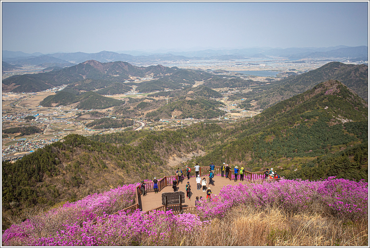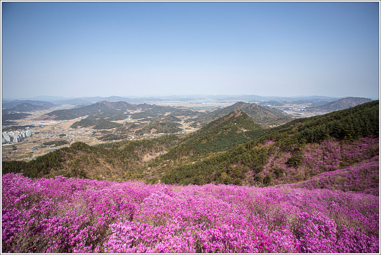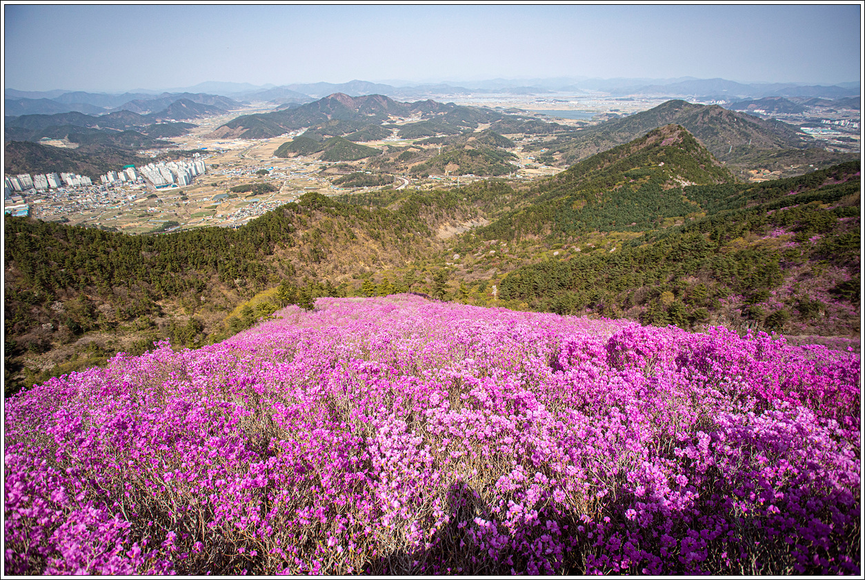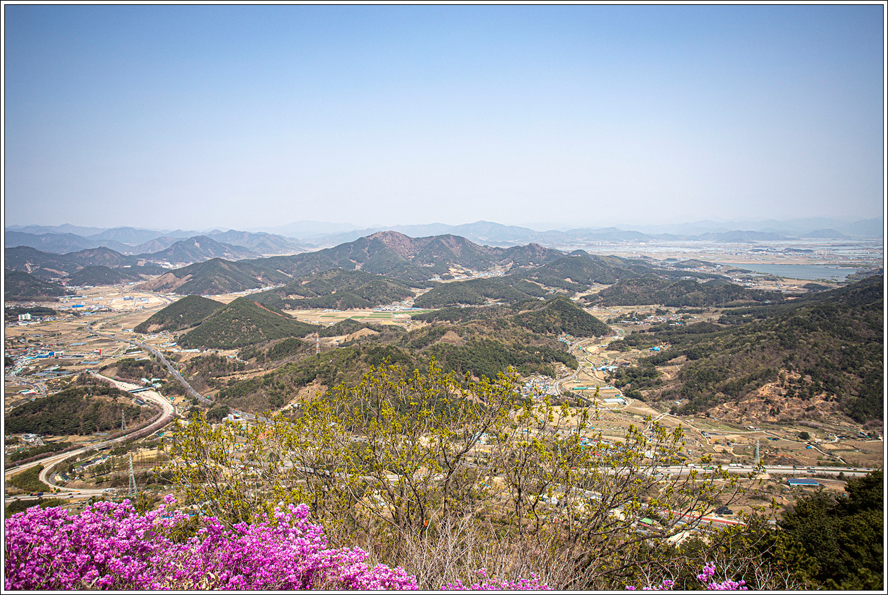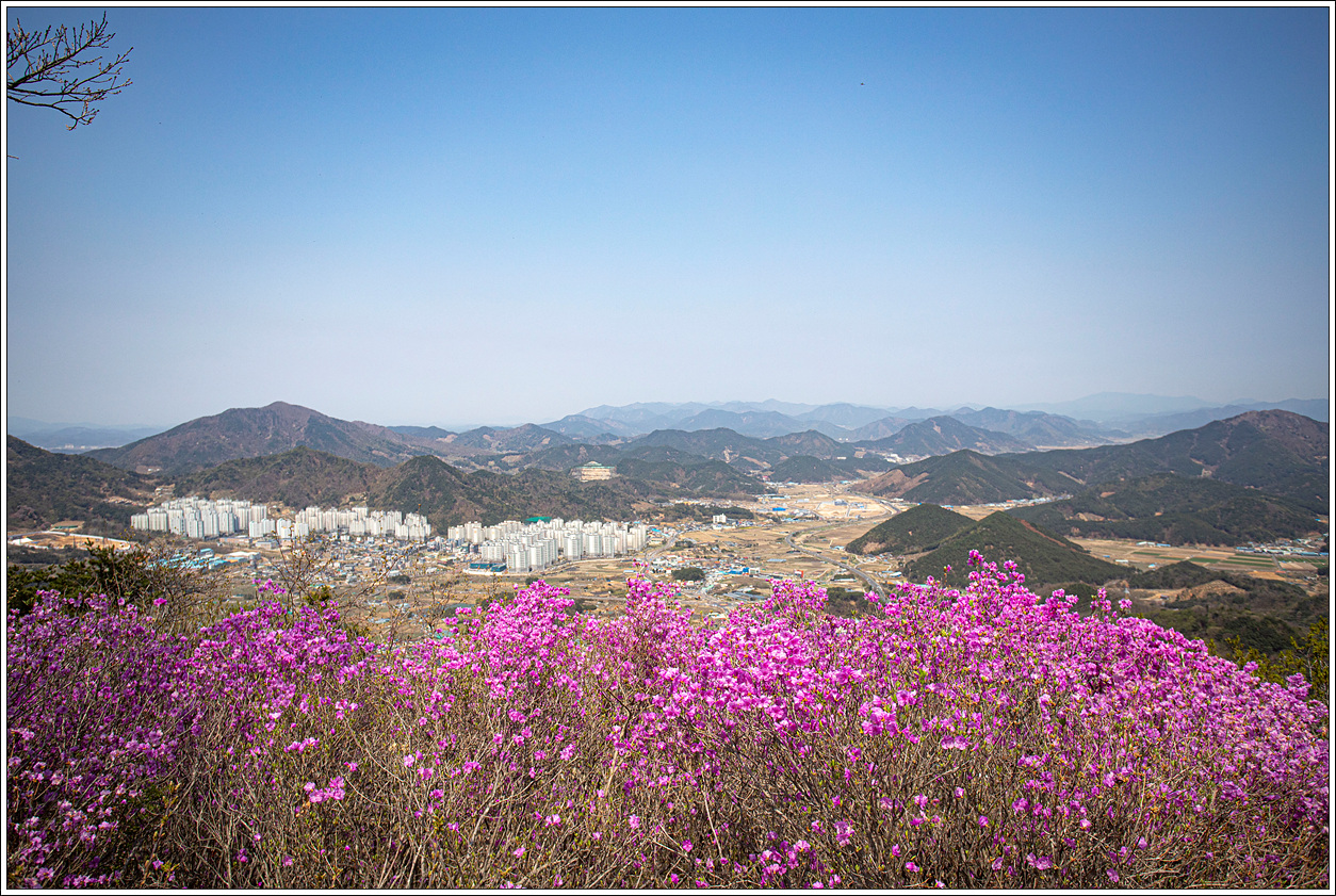 ▽ 북쪽으로 왼쪽 무릉산(565.1m)과 오른쪽 백월산 주변의 풍경이 만개한 진달래와 함께 조망된다.