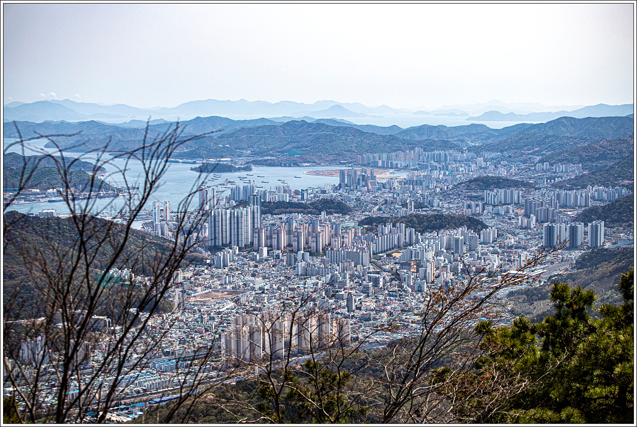 ▽ 정상에서 남쪽으로 시선을 돌리면 진해만의 바다가 마산합포구 시내와 함께 조망되고 오른쪽으로 무학산이 바라다 보인다.