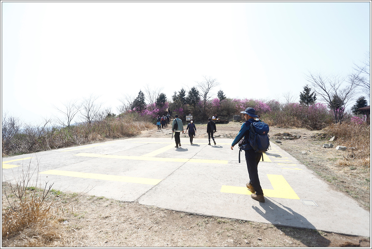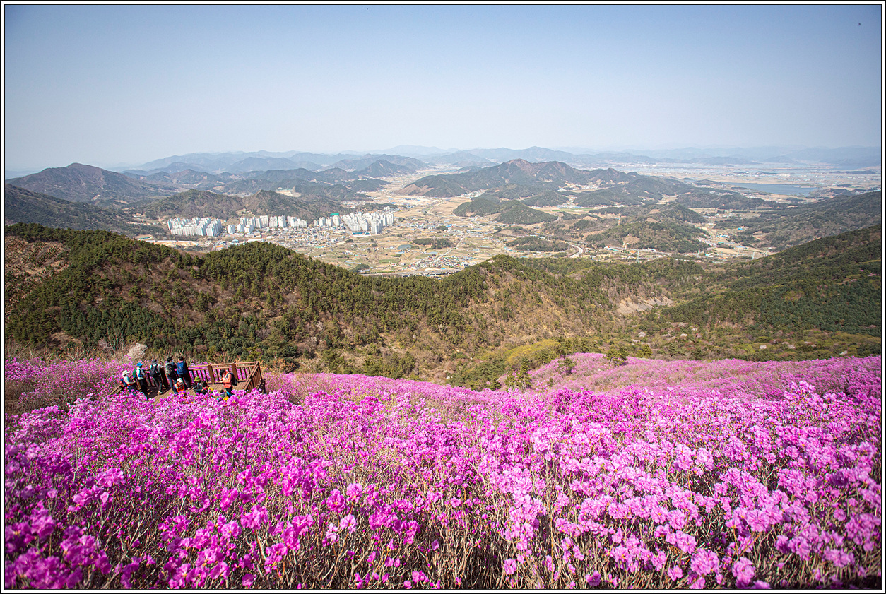 ▽ 식사 후 잣나무 숲이 끝나는 지점에 숲 사이로 보이는 선홍의 진달래 색감에 모두가 신기해 하다가 전망대에 이르러서는 감탄사가 절로 나온다.