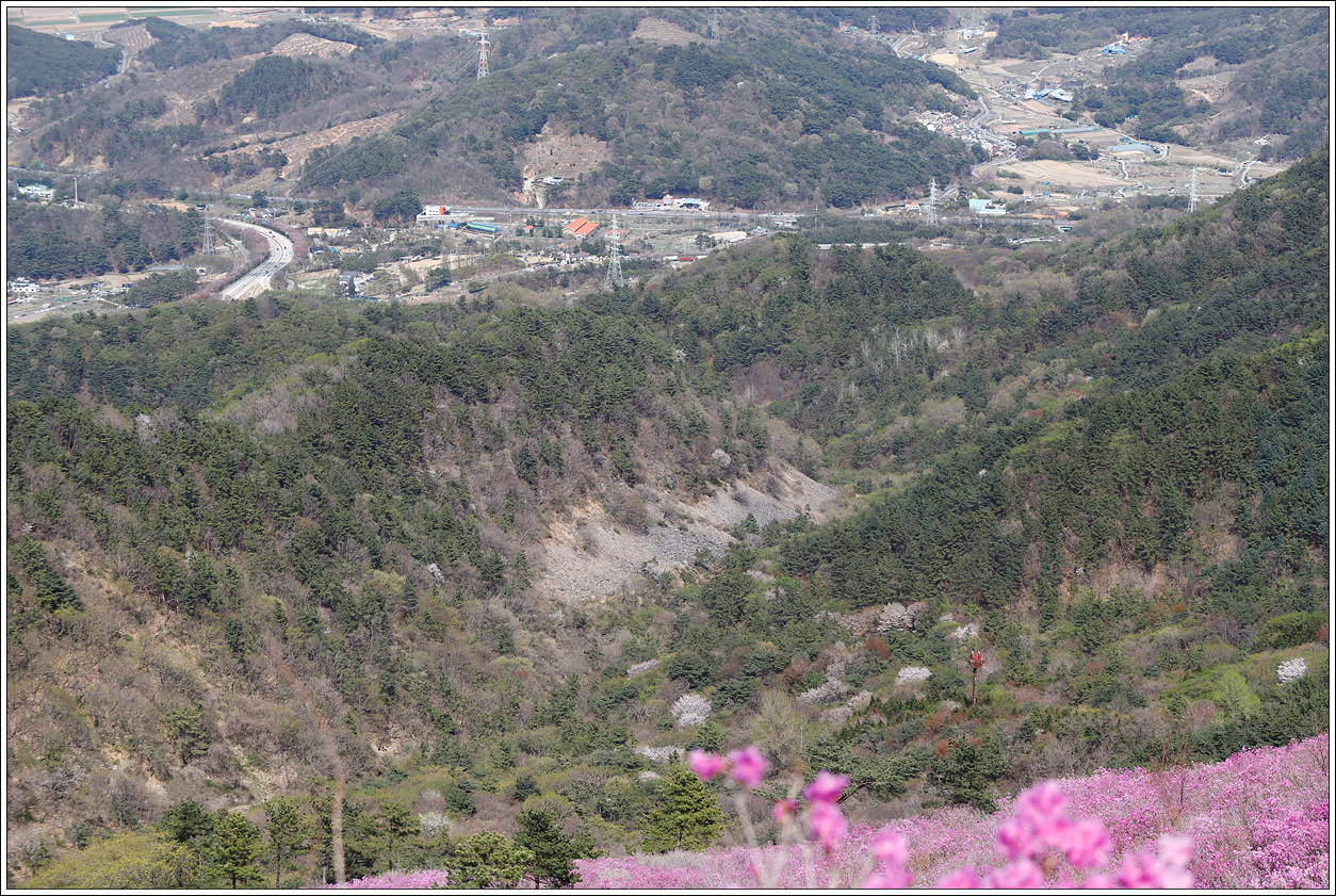 ▽ 드디어 진달래 군락지의 모습이 한눈에 들어온다. 아랫 쪽의 흰색은 벚꽃이 아직 지지 않은 상태로 마치 폭포수 같이 계곡에 핀 모습이다.