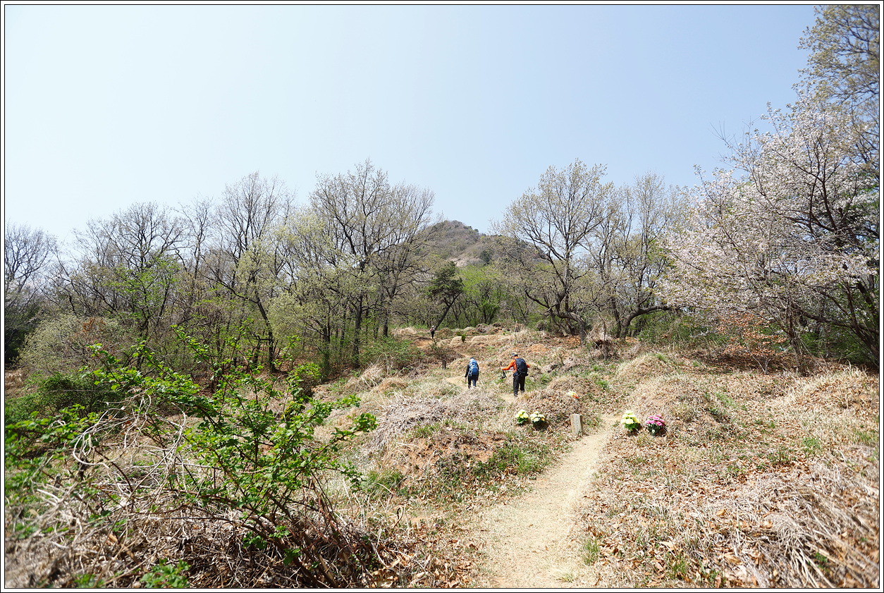 ▽ 들머리에 도착하니 기온이 20도가 넘을 듯한 다소 덥기까지 한 날씨다. 일부 사람들은 반팔을 착용했다. 벚꽃은 시내에는 벌써 졌고 산중의 벚꽃은 꽃이 좀 붙어 있는 상태다. 벚꽃보다 진달래가 먼저 개화하기는 하지만 벚꽃은 만개 후 열흘 넘기기가 어려운 것을 감안하면 진달래는 아직 낙화하거나 색이 바래지 않았을 것이란 기대감을 안고 오른다.