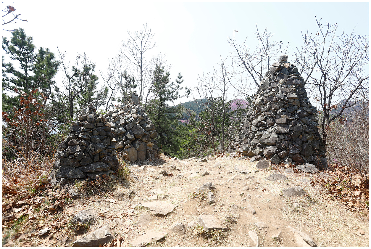 ▽ 2주전에 올랐던 남동쪽 방향의 장복산은 왼쪽 능선이 하얗게 잡힌 것으로 봐서 저곳 역시 오늘이 진달래, 벚꽃의 절정일 것이란 생각이다. 바로 앞 등명산 자락에 창원중동유니시티아파트의 모습이 인상적이다.