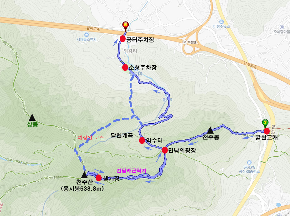 ♣ 산행코스: 굴현고개-천주봉-만남의광장-용지봉(정상)-만남의광장-달천약수터-달천계곡-소형주차장-공터주차장