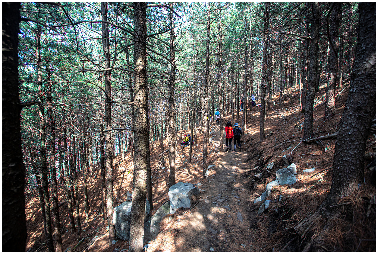 ▽ 들머리에서 900미터 거리의 천주봉을 오르는데 40분이나 걸렸다. 급경사를 오르는데 지열로 인해 후끈거리고 땀을 삐질 흘려야만 오를 수 있는 봉우리다.