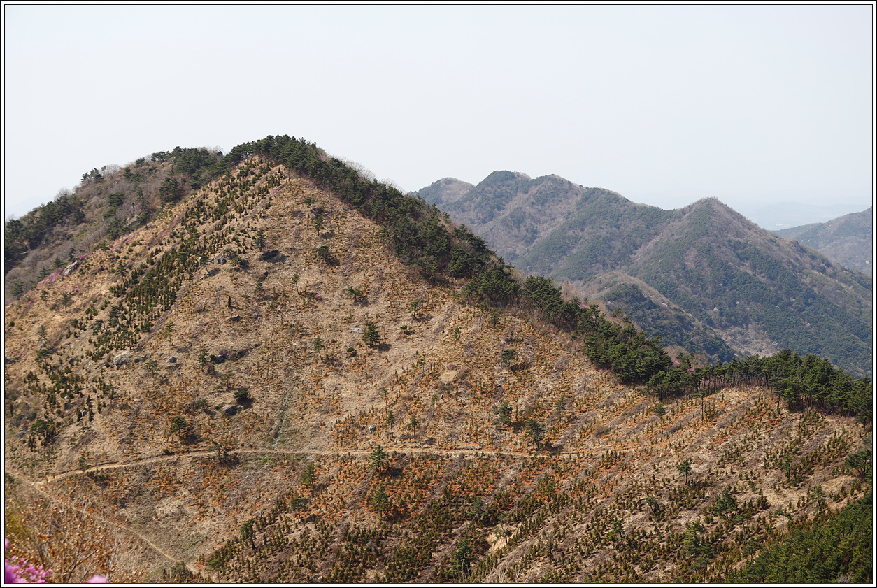 ▽ 건너편 상봉이 벌목으로 인해 민둥산이 됐다. 어린나무를 식재한 것 같은데 아마도 편백나무가 아닐까 싶다. 저곳도 이왕 민둥산이라면 진달래를 식재하여 군락지로 조성한다면 그 어느 지방의 진달래 군락지와 비견이 안될 것으로 지형상으로 봐도 너무 좋겠다는 생각은 나만의 생각이 아닐 것이라 여겨진다.