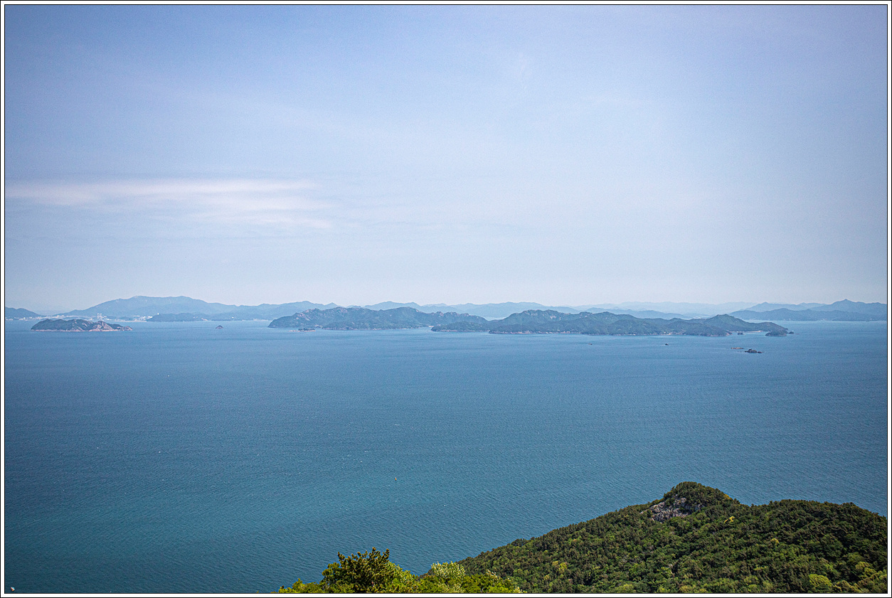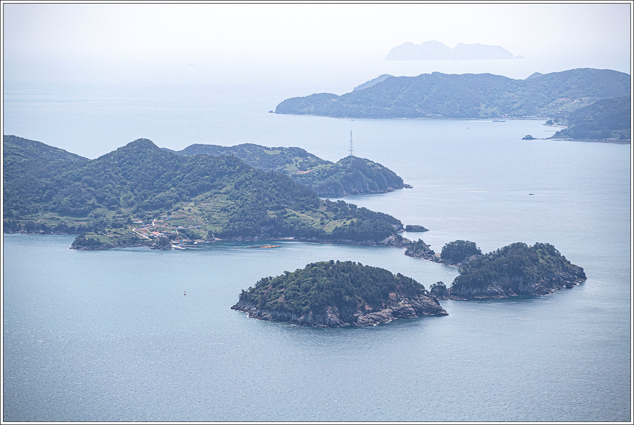 ▽ 정상에서 바라 본 남쪽 방향의 왼쪽 상노대도와 오른쪽 욕지도 풍경으로 점점이 떠 있는 섬들이 그림 같이 다가온다.