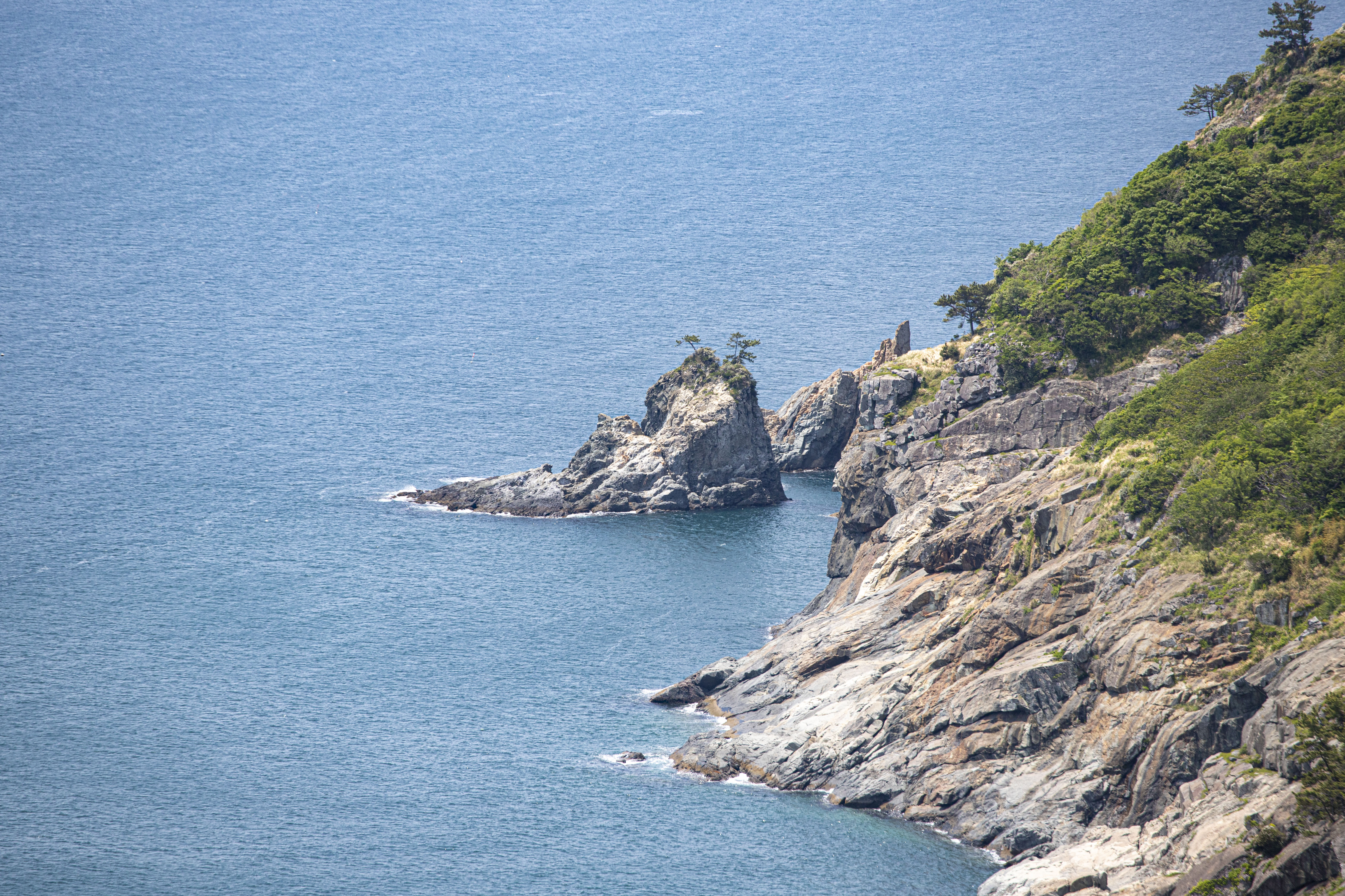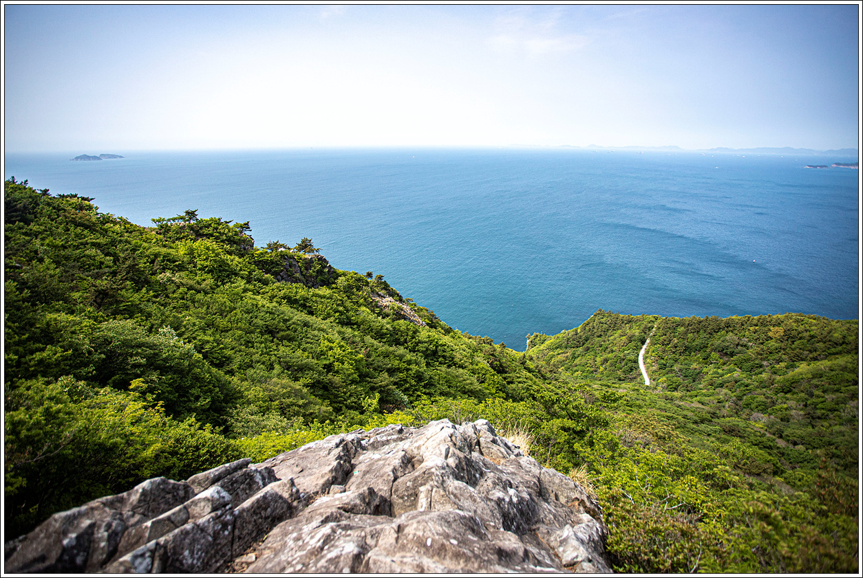 ▽ 천황봉을 오르기 위해 막바지 급경사를 올라 내려다 보니 쪽빛 바다에 일망무제인 풍경이 가슴을 시원하게 한다.