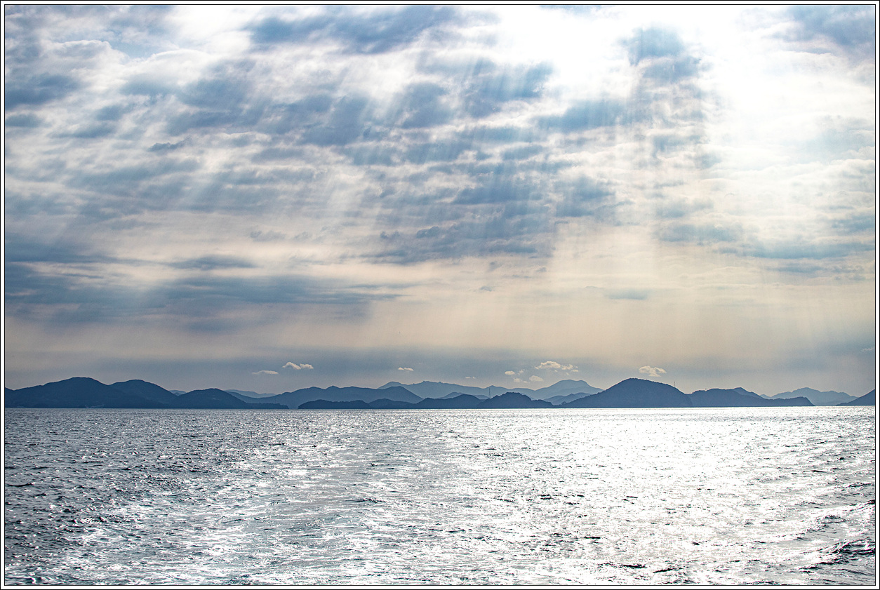 ▽ 왼쪽의 한산도와 오른쪽 용초도 사이로 멀리 거제지맥에 자리한 노자산이 빛 내림 속에 돋보인다.