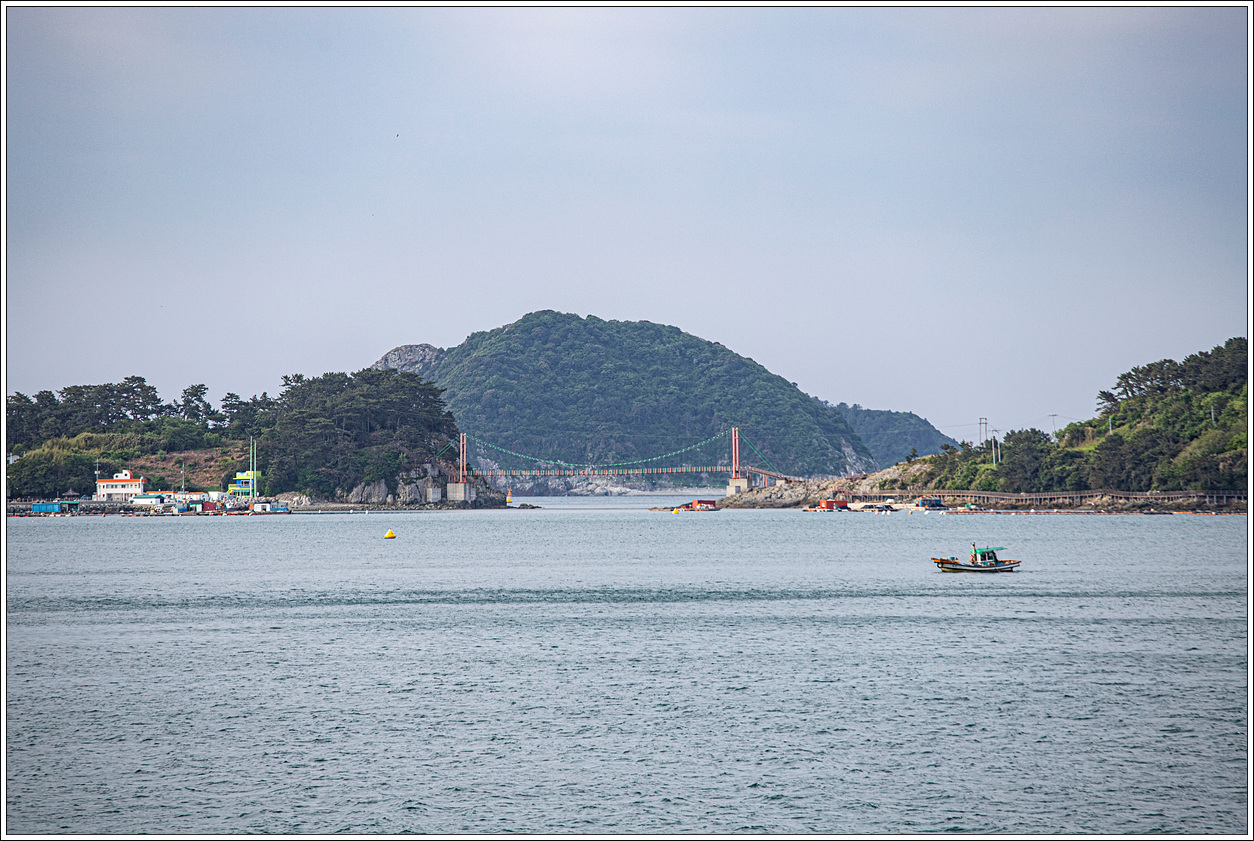 ▽ 연대도와 만지도는 산양읍 달아항에서 하루 4차례 오가는 배를 타고 15분이면 도착하는 섬이다. 출렁다리 사이로 남쪽으로 떨어져 있는 내부지도 일부가 보인다.