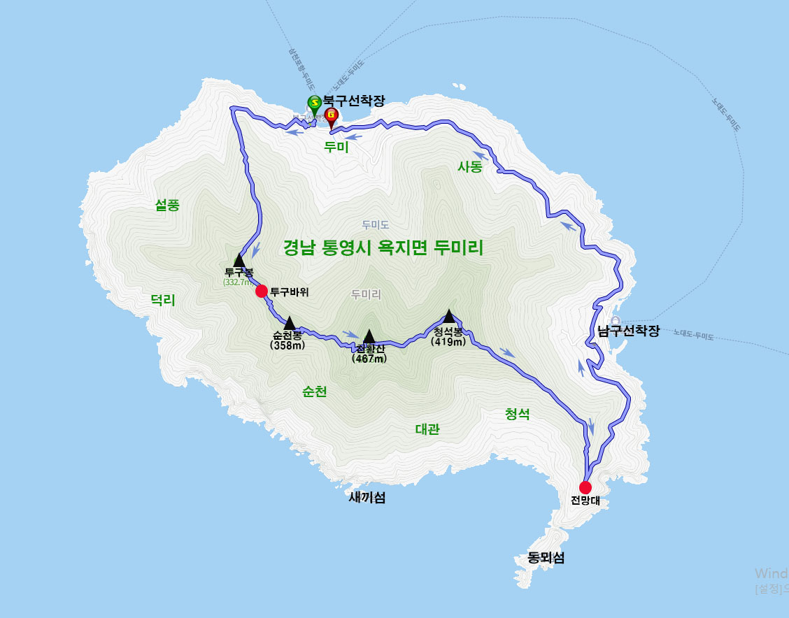 ▽ 통영항에서 두미도 북구선착장까지 가는 소요시간은 1시간 20분으로 하루 한 번만 운항하기 때문에 산행은 거리가 짧던 길던 간에 두미도에서 통영으로 오는 배 시간에 반드시 맞춰야만 한다.