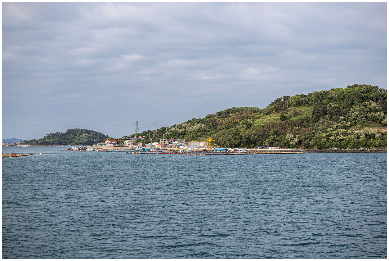 ▽ 드디어 통영항에서 출항한지 1시간 20분만에 도착한 두미도 선착장의 북구마을과 가운데 천황산의 풍경