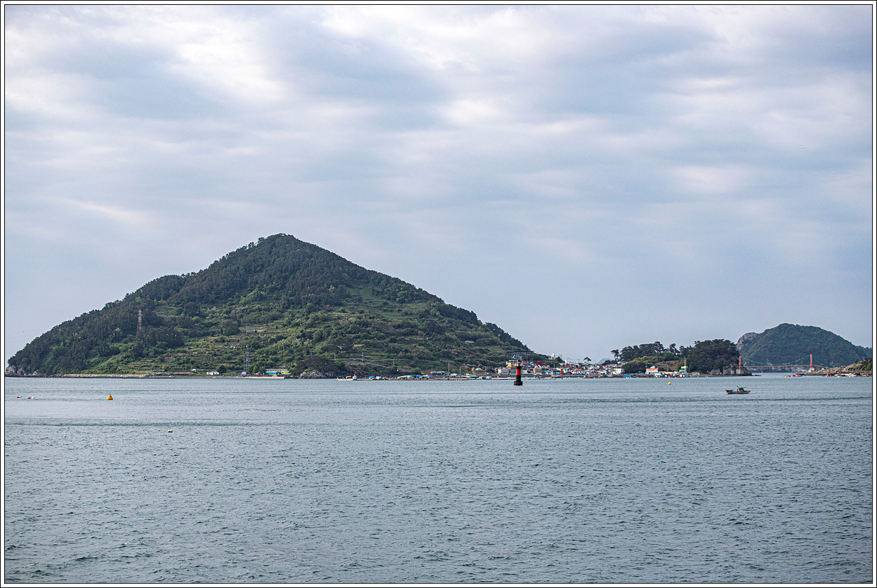 ▽ 연대도의 연대봉(220m)이 우뚝 솟아 보이고 그 아래 연대마을의 집들이 밀집되어 있다.