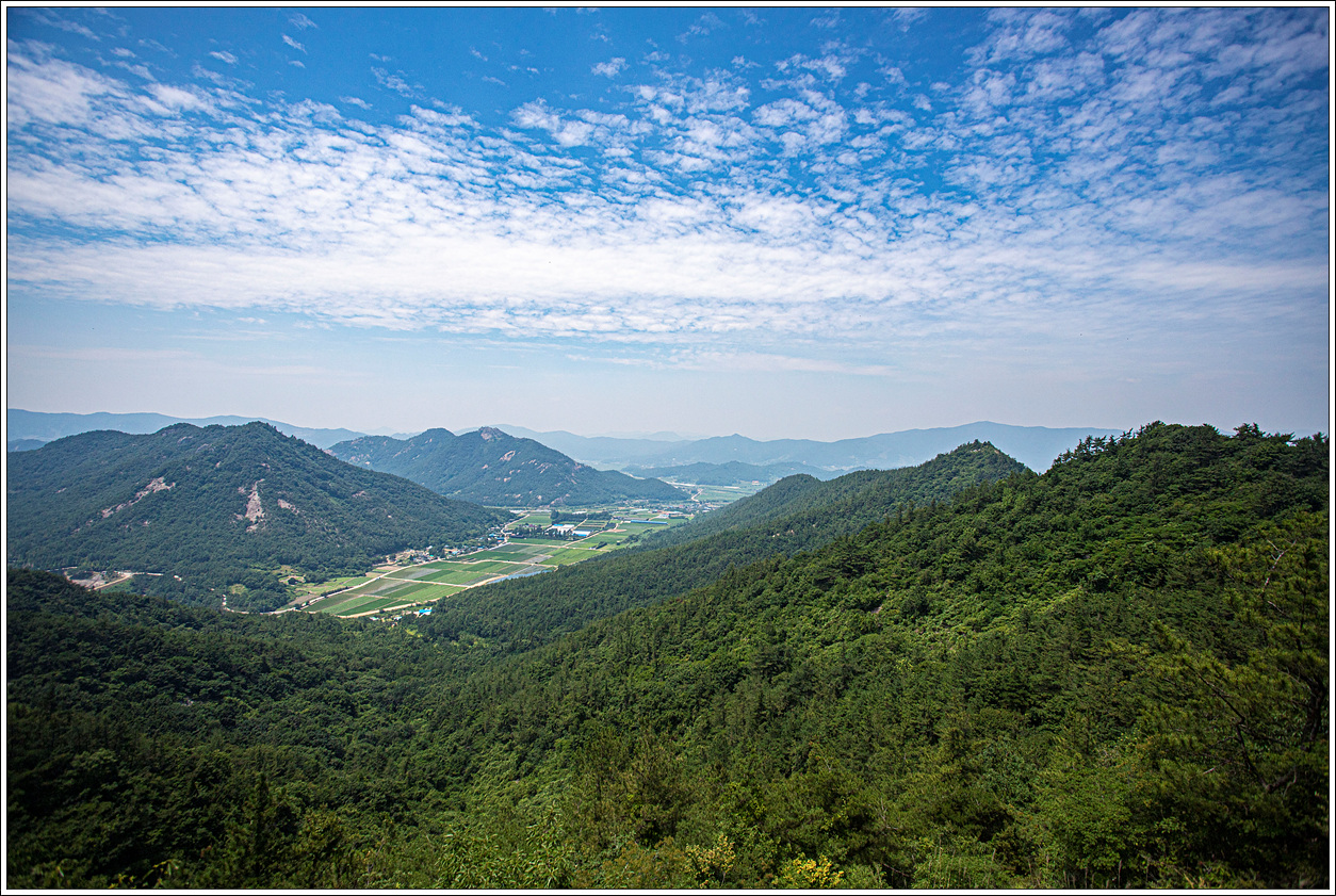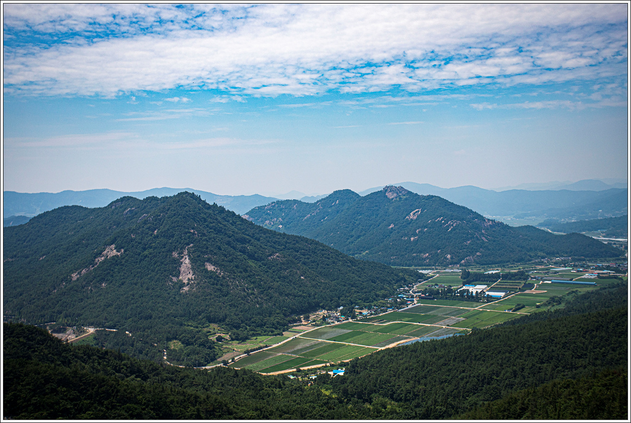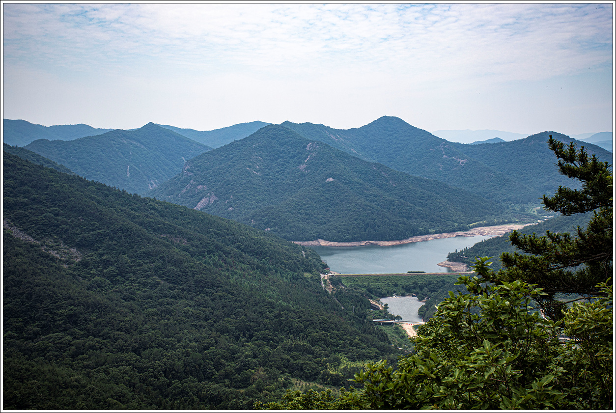 ▽ 서쪽편의 산 능선 아래 계곡에는 해평저수지가 자리하고 있고 저수지 뚝 아래로는 커다란 주차장에 차가 한대도 보이질 않아 마치 작은 저수지로 착각이 든다. 애초 계획은 저곳 용추주차장에 버스를 대기하고 저곳까지 가기로 되어 있었으나 아스팔트 길로 2km를 내려가야 하는 상황이므로 34도의 날씨를 고려하여 2km 윗쪽에 있는 칼바위주차장까지를 날머리로 수정했다.
