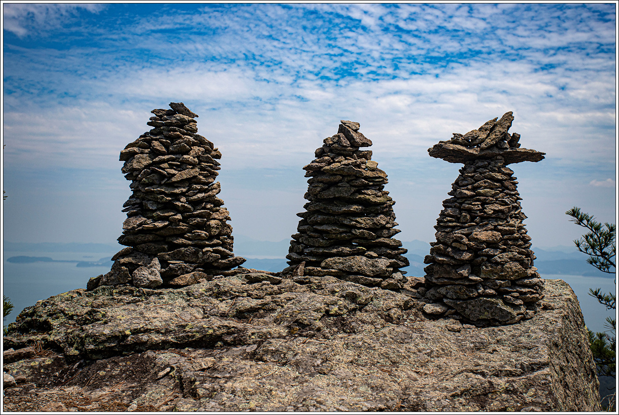 ▽ 돌탑이 있는 봉우리에 오르기 전 꼬마돌탑 삼형제가 앙증맞게 세워져 있다.