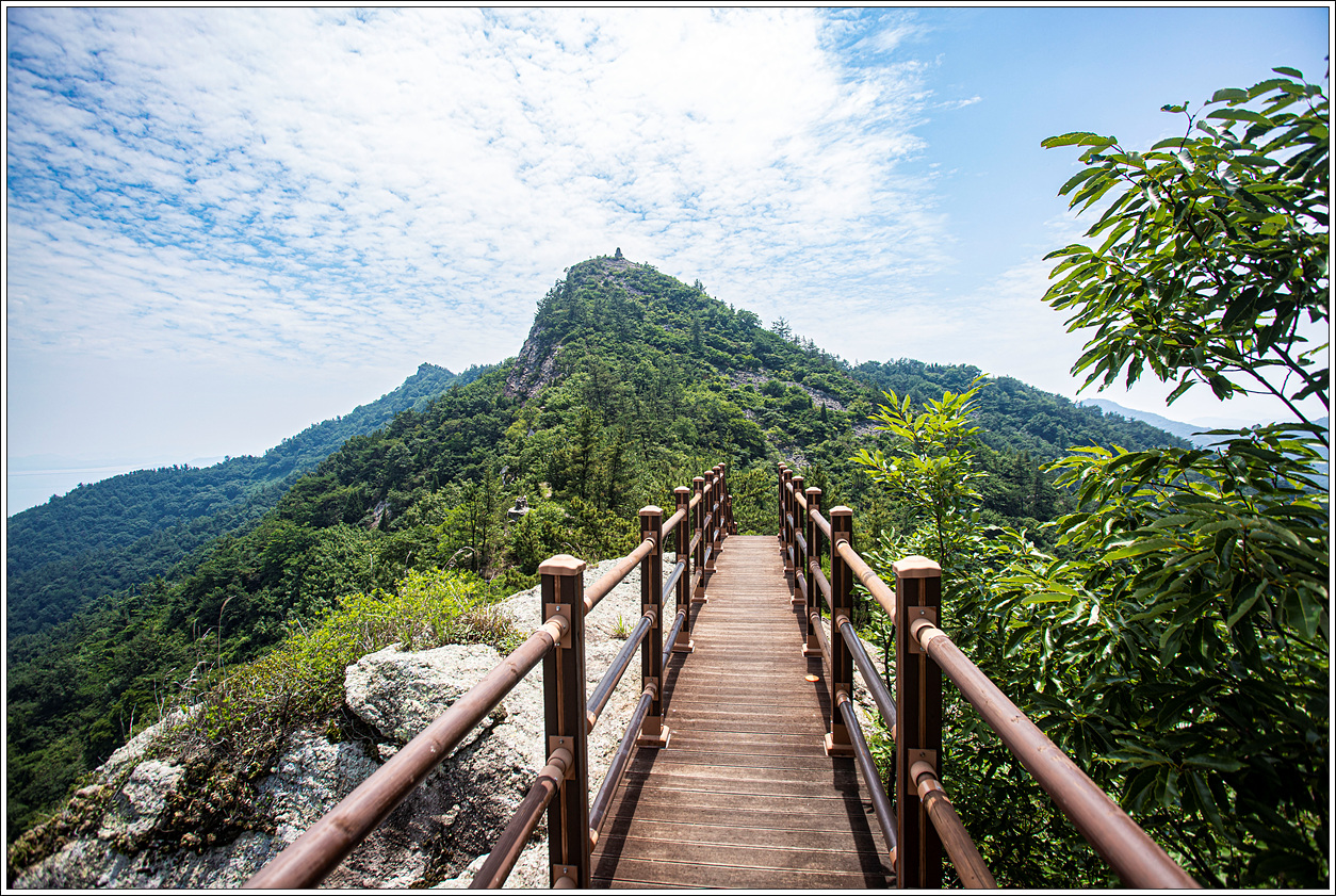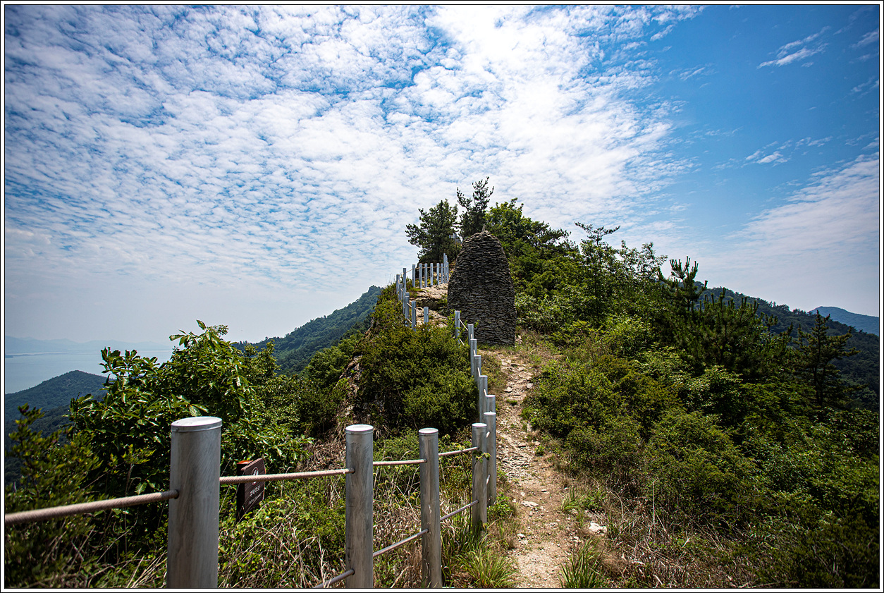 ▽ 동쪽의 득량만 방향으로는 절벽지대여서 안전시설을 해 놨다. 걷는 내내 이렇게 안전시설이 잘 되어 있어 산객들을 위한 지자체의 배려가 돋보이는 오봉산이다.