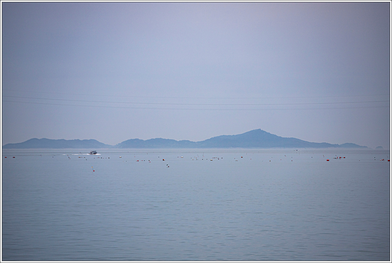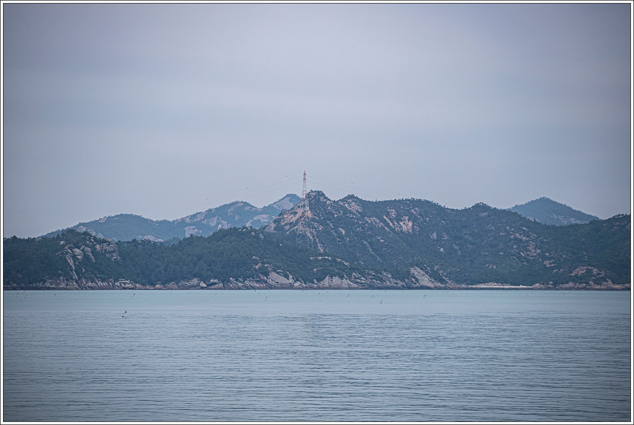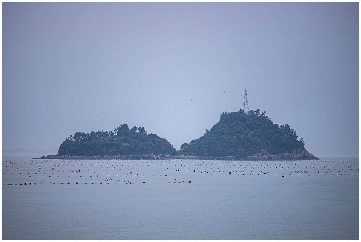 ▽ 형제도...아무리 작은 섬일지라도 이렇게 전선 철탑을 세워 전기 공급 등을 하기에는 그만이다. 주변에 바다 양식으로 부표가 빼곡히 자리잡고 있다.