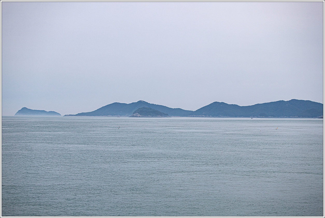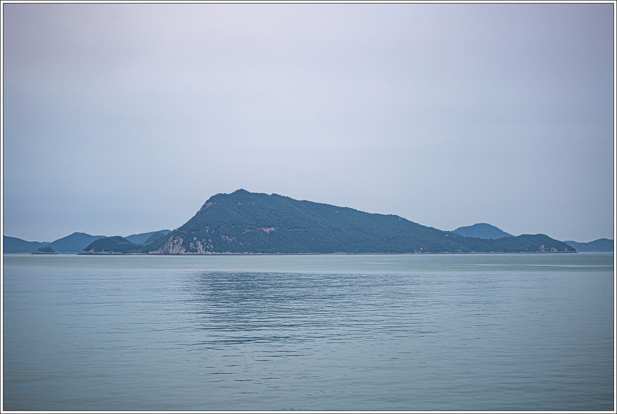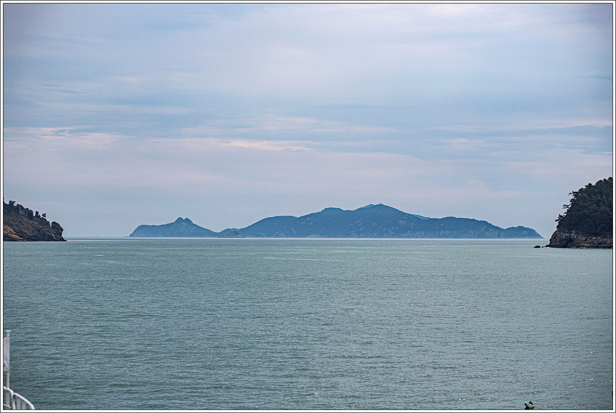 ▽ 오늘 도착하자마자 산행을 먼저 할 초도 동쪽에 위치한 손죽도가 또한 그 모습을 드러냈다. 맨 왼쪽의 검은 섬이 무학도, 바로 오른쪽으로 가장 높게 보이는 산이 소거문도의 산이고 그 오른쪽부터가 길게 손죽도이니 모두가 겹쳐 보여서 한 섬으로 보인다.